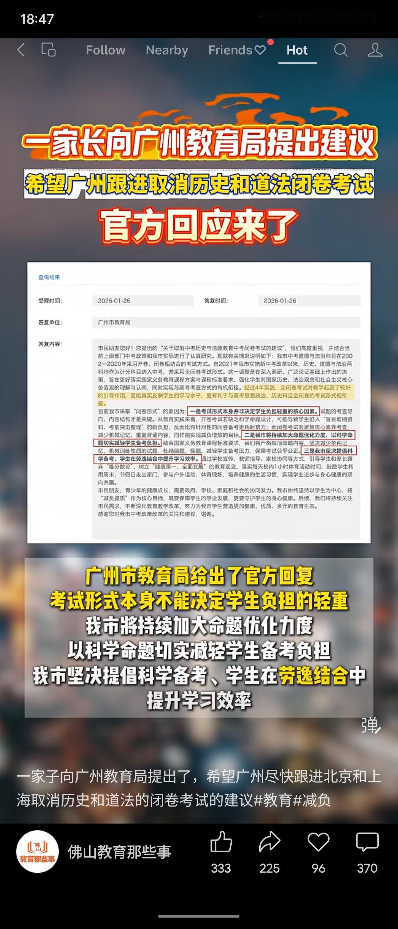 家长建议广州跟进北京上海,取消中考历史和道法的闭卷考试以减轻学生过重负担。广州市教育局回应,现行闭卷考试政策经过审慎研究,旨在落实课程标准、强化价值观认同,并与高考衔接,目前将继续维持。