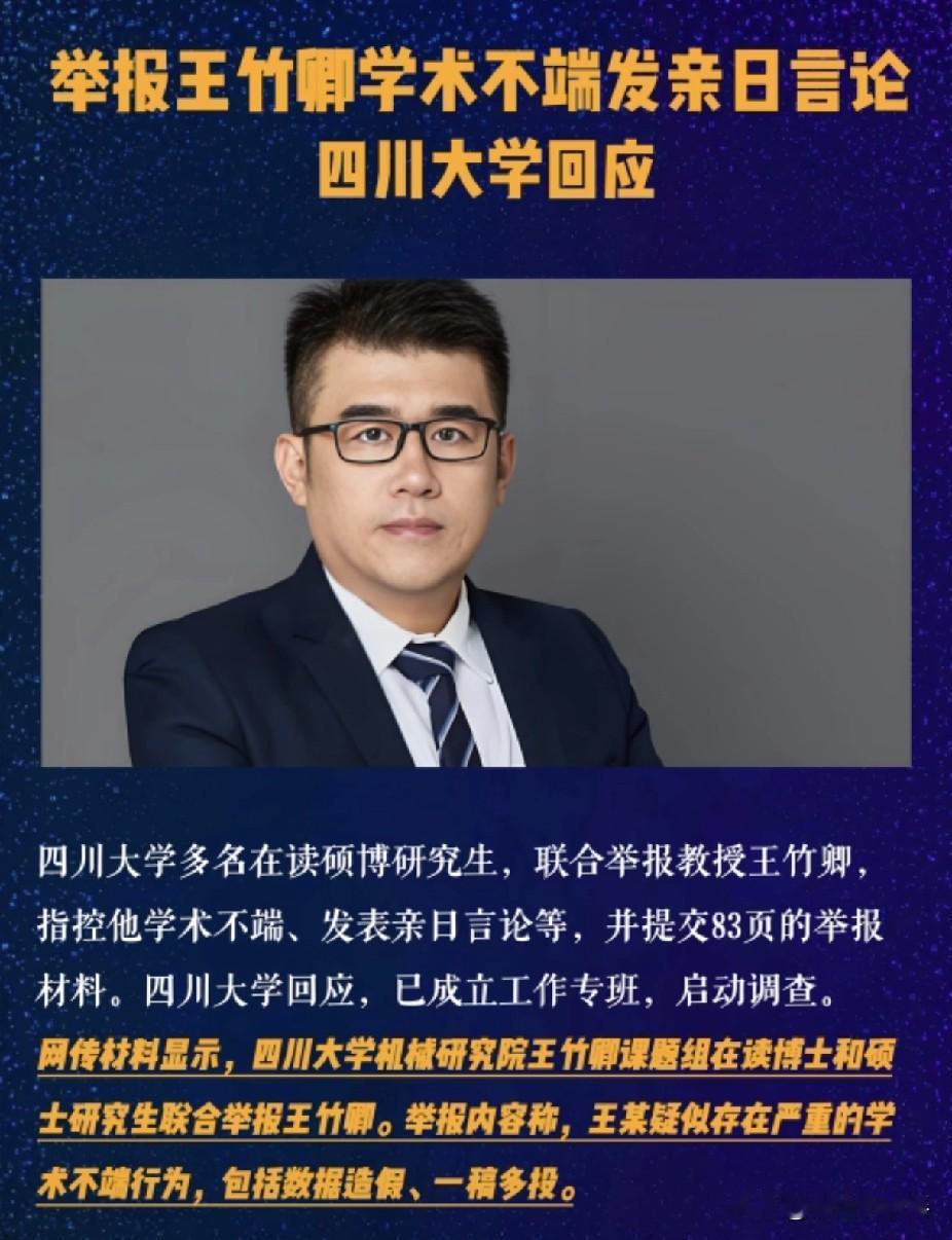 川大博导王竹卿在群里威胁举报他的学生:“周一等律师函哈。” 学生也不甘示弱,答复:“好的老师,我们一起。” 短短两句对话,把高校师生关系里最刺眼的矛盾摆到了台面上。本该传道授业的导师,面对学生举报第一反应不是沟通澄清,而是用律师函施压,这种处理方式偏离了教育者应有的立场,也让公众看得心头一紧。 这次事件并非临时冲突,而是长期矛盾积累后的集中爆发。多名研究生联名提交了详细举报材料,包含聊天记录、实验相关凭证、录音等内容,对导师在学术、管理、日常指导等方面提出多项具体质疑,并非没有依据的情绪宣泄。 学生敢集体站出来发声,背后是多次内部沟通无果后的无奈选择。他们曾尝试通过正常渠道反映问题,却没能得到有效解决,反而在沟通中感受到压力,最终选择公开举报,对很多学生来说,已经是没有退路的选择。 高校导师对学生的学业发展、论文进度、毕业环节都有重要影响,这种影响力一旦使用不当,很容易形成不对等的关系氛围。学生长期处于相对弱势的位置,不敢轻易表达不满,直到矛盾激化才选择抱团发声,这也是事件最让人唏嘘的地方。 王竹卿在群内公开表示将发送律师函,本质上是想用法律途径回应举报,试图通过正规程序维护自身权益。但这种公开表态在舆论视角下被解读为施压,不仅没能平息争议,反而进一步激化对立,也让更多网友关注到事件本身。 学生一句“我们一起”,看似平静却态度坚定。这不是刻意对抗,而是不愿再沉默、希望问题得到公正处理的态度。一群年轻人愿意共同面对后续流程,说明他们对公平处理的期待,超过了对后续压力的担忧。 四川大学已经正式成立工作专班,对相关问题展开全面调查,并对外表示会依规处理、及时公布结果。校方及时介入是还原真相、化解争议的关键,公众最期待的不是舆论站队,而是完整事实与公正规范的处理。 学术领域最需要的是坦诚面对监督、用事实回应质疑,而不是用强硬姿态压制不同声音。真正有底气的学者,会坦然接受核查,用规范与证据回应争议,而不是依靠外部施压维持形象。律师函解决的是纠纷,却不能替代事实与调查。 不少高校都出现过类似师生矛盾,根源往往是沟通机制不顺畅、监督渠道不够透明、权力边界不够清晰。导师与学生地位不对等、学生维权路径不明确,小问题容易拖成大冲突,最后只能通过网络曝光引发关注,这是高校治理需要持续完善的地方。 举报材料中提及日常指导、实验环境、经费使用等方面的相关质疑,每一项都涉及师德规范与学术管理的基本要求。这些内容是否属实,需要校方通过严谨调查给出结论,不能仅凭网络片段下判断。 很多网友感慨,现在的研究生不仅要完成科研与学业任务,还要处理复杂的师生关系,本该纯粹的求学环境,被各种现实问题影响,这对正常的教育与科研生态,确实是一种不必要的消耗。 事件发酵至今,双方表述存在差异,涉事教师已就相关争议报警,学生则坚持自身反映内容属实。在官方调查结论公布之前,不随意定性、不传播未经证实的细节,是对事实最基本的尊重。 教育的核心是尊重、引导与相互成就,不是压制与对立。导师的身份是学业引路人,而非学生前途的掌控者,一旦忘记这份初心,再高的学术头衔,也难以撑起为人师表的真正意义。 各位读者你们怎么看?欢迎在评论区讨论。