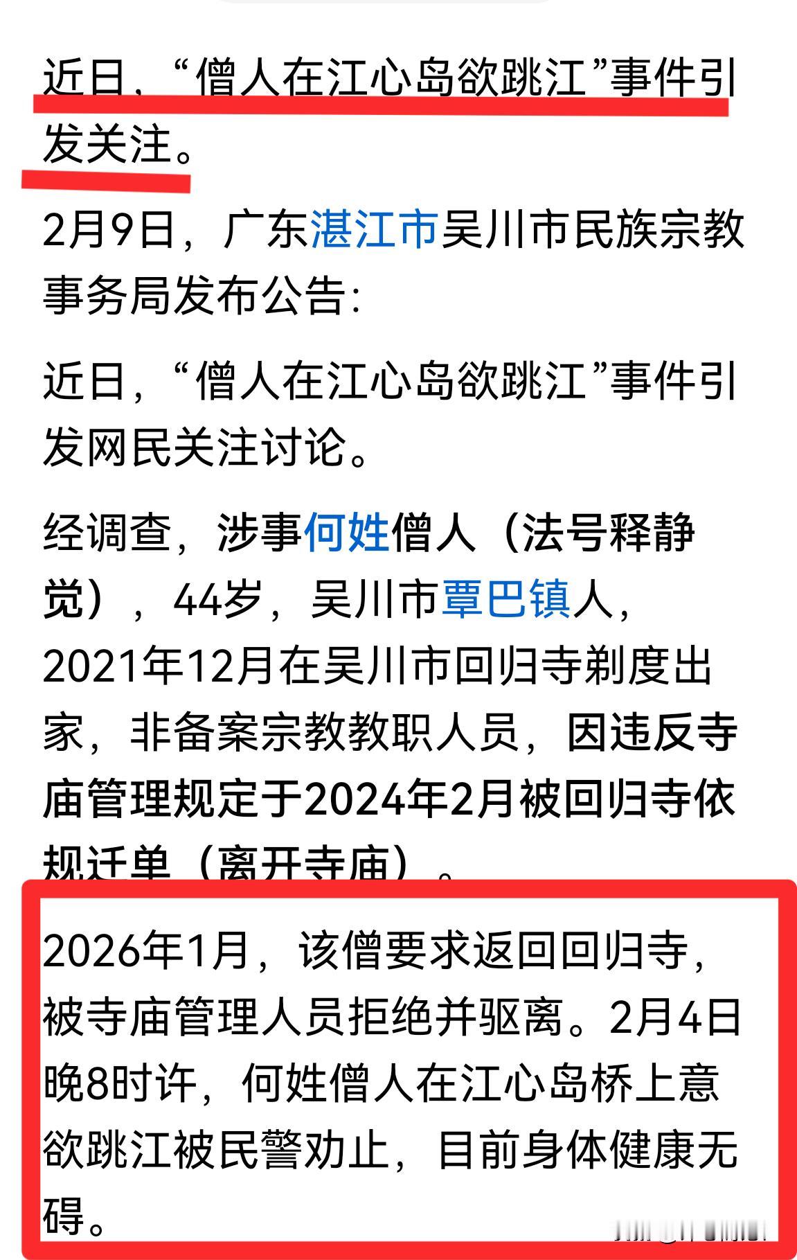 反转|扶灯大师(和尚释静觉)跳水获救,没死!救上来后入住ICU,后转入普通病房,生命体征平稳,主要是溺水引发肺部感染,叠加基础糖尿病,需持续吸氧与对症治疗。 评心而论:人没事就好!本来他是渡得过众生,却渡不了自己。寒夜扶灯,纵身一跳,万幸留命,更要留路,愿这一次“没死”的幸运,能换来真正的转机!