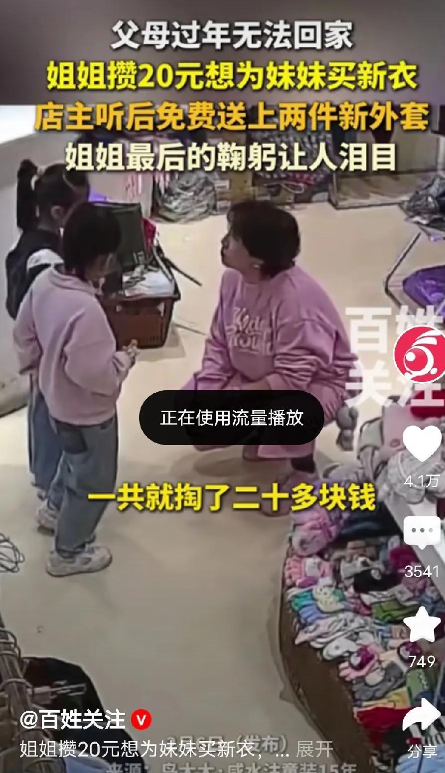 都说好人一生平安,姐姐拿着20元钱去童装店里给你妹妹买衣服,店家一看很是惊讶,询问两个孩子,孩子回答店家,父母不回家过年,我这是给妹妹买新衣服。 两个孩子姐姐都没有穿外套,妹妹穿着一个很薄的外套,姐姐手里攒着20元钱,老板看了后直接拒绝收钱,先是拿了一件羽绒服,回头又拿了一件给姐姐穿上,老板娘一看就是好人呢。 老板的热心肠就是值得我们学习和表扬,让开店的老板都看看,这样的老板就应该让她发财,很多网友计划去她店里消费,给自己家里孩子买衣服。