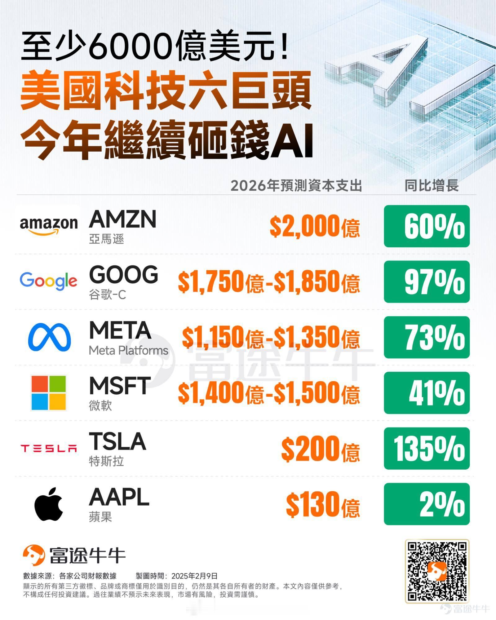 美国六大公司今年的资本开始合计超6000亿美元。AI的故事只是进行到了中间。