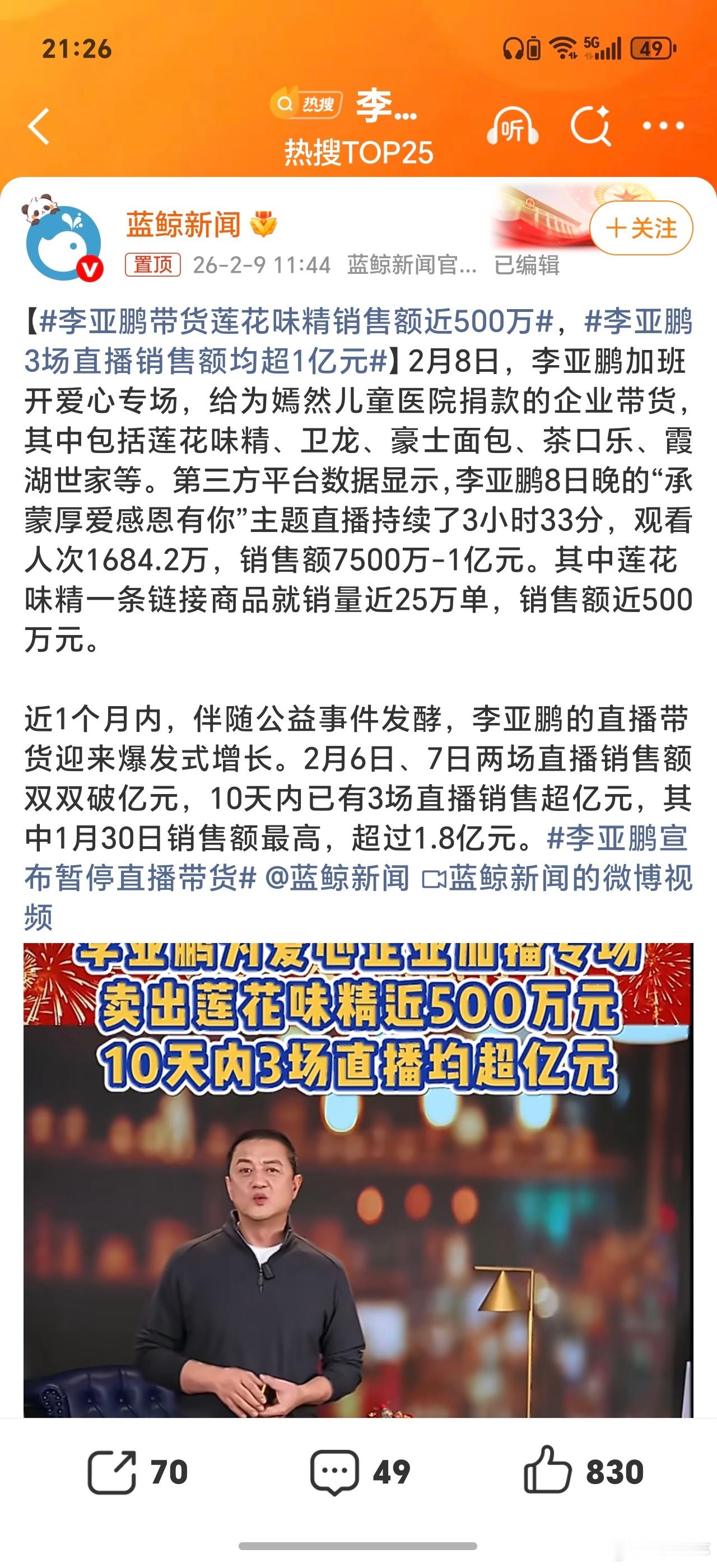 李亚鹏带货莲花味精销售额近500万李亚鹏为捐款方带货,“沉默的报恩”+国货品牌复兴,确实很有意义!实际效果也非常不错,不但带货数据漂亮,李亚鹏最近也涨了很多粉。