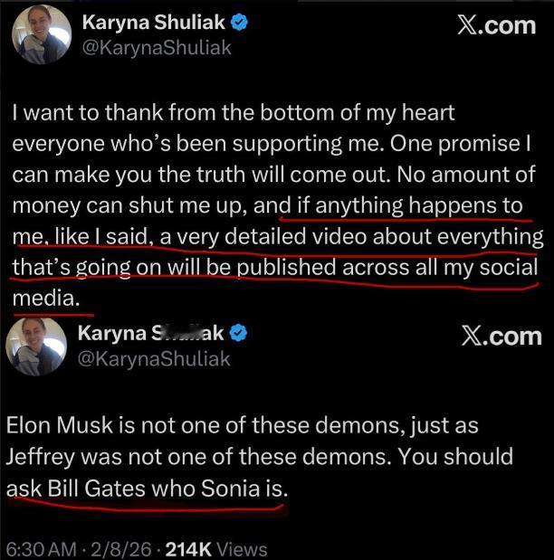 爱泼斯坦女友反击:如果我死了就曝光一切,应该问问比尔盖茨“索尼娅”是谁?2月8日,爱泼斯坦的女友卡琳娜·舒利亚克,突然在社交媒体平台发声说:“我向你们保证真相会水落石出,没有人能用钱让我闭嘴,如果我发生任何意外,我会在所有社交媒体平台上,发布一段非常详细的视频,说明所有情况。” 她还发帖称:“马斯克不是最邪恶的恶魔,爱泼斯坦也不是,你应该问问比尔·盖茨“索尼娅”是谁。”这个索尼娅难道就是,让比尔盖茨染上性病的那一个?貌似没有这么简单…… 卡琳娜·舒利亚克的发声绝非随口说说,能在这个节点公开叫板,还放出“出事就曝光视频”的狠话,背后必然握着足够分量的信息,不然不会冒着风险直面潜在威胁。 她特意把马斯克和爱泼斯坦从“最邪恶”的标签里摘出来,转而让公众追问比尔·盖茨“索尼娅”是谁,这本身就说明“索尼娅”相关的事,比已知的爱泼斯坦案丑闻更关键,也更能撕开精英圈的隐秘遮羞布。 外界猜测“索尼娅”是让比尔·盖茨染上性病的人,并非空穴来风,这和爱泼斯坦案解密文件里的细节能对上。 2026年1月底公布的300多万页文件中,有一封2013年爱泼斯坦写给自己的,未发送邮件草稿,里面明确提到,盖茨和一名“俄罗斯女孩”发生关系后感染性病,还恳求爱泼斯坦帮忙获取抗生素,计划偷偷给前妻梅琳达服用以隐瞒病情。 这些描述和“索尼娅”的指向,形成了潜在关联,但事情显然不会只停留在,私人丑闻层面。 如果“索尼娅”只是单纯的私人关系对象,卡琳娜没必要在如此严肃的声明中特意点出,更不会将其与“最邪恶”的评价挂钩。 爱泼斯坦的圈子本质是,顶级权贵的隐秘社交网络,成员之间靠金钱、人脉、信息互相绑定,形成利益共同体,“索尼娅”很可能是,这个网络里的关键连接点。 她或许不只是和比尔·盖茨有私人往来,更可能参与到圈子内的权力交换、利益输送甚至非法活动中,成为各方平衡的棋子。 比尔·盖茨和爱泼斯坦的关系,一直疑点重重,盖茨自己说交往是为了慈善,却没法解释为什么明知对方是性犯罪者,还多次会面甚至搭乘其私人飞机。 爱泼斯坦曾试图促成,盖茨基金会与摩根大通的合作,失败后就写下了指控盖茨的邮件,这背后明显有利益纠葛和报复动机。 而盖茨前妻梅琳达的回应更能说明问题,她称解密文件勾起了婚姻中“非常痛苦的回忆”,还说“远离那片污秽”,这间接证实盖茨与爱泼斯坦的往来绝非单纯的慈善讨论,“索尼娅”很可能就是这些“污秽”中的关键一环。 “索尼娅”的名字本身就透着蹊跷,在爱泼斯坦的精英社交圈里,成员之间常用化名或代号,隐藏真实关系,避免留下可追溯的痕迹。 目前公开信息里没有明确的,“索尼娅”与比尔·盖茨的直接关联记录,但这恰恰符合精英圈隐秘交易的特点,越关键的人物和关系,越会被刻意掩盖。 卡琳娜作为爱泼斯坦的女友,长期处于这个圈子的核心边缘,有机会接触到这些不为人知的代号和背后的关联,她的爆料绝非无的放矢。 性病传闻或许只是冰山一角,用来掩盖更深层次的黑幕。比尔·盖茨的公众形象一直是理性、利他的慈善家,但此次事件中的种种疑点,让这一人设逐渐崩塌。 公众开始质疑他的慈善动机是否纯粹,盖茨基金会作为全球最大的私人慈善机构,其决策公正性是否受到私人关系的干扰。 “索尼娅”的身份如果曝光,很可能会牵扯出盖茨在商业合作、基金会运作中与爱泼斯坦圈子的利益交换,这些交易远比私人丑闻更能撼动他的地位。 卡琳娜的声明本身就是一种博弈,她强调“没有人能用钱让我闭嘴”,暗示已经受到过利益诱惑或人身威胁。 而“发生意外就曝光视频”的表态,说明她已经做好了最坏的打算,手里的视频很可能包含“索尼娅”相关的直接证据,比如见面记录、交易细节或对话录音,这些证据足以让某些权贵坐立难安。 她选择在司法部公布爱泼斯坦案文件之后发声,就是想借助舆论热度为自己增加安全筹码,让更多人关注“索尼娅”的疑问,形成无法轻易压制的舆论压力。 比尔·盖茨的回应也充满漏洞,他否认所有指控,却只道歉说“后悔和爱泼斯坦相处”,避重就轻地将往来归结为“慈善目的”。 这种辩解无法解释,他为何不顾梅琳达的多次反对,执意与爱泼斯坦保持联系,更无法说明爱泼斯坦为何会掌握所谓“性病”的相关细节。 如果“索尼娅”只是子虚乌有,卡琳娜不会冒着风险公开点名,爱泼斯坦也没必要在邮件中刻意记录相关内容,这背后必然有尚未曝光的隐情。 卡琳娜的发声不是终点,而是更多真相浮出水面的开始。她手里的视频证据、爱泼斯坦案未完全曝光的文件、比尔·盖茨与爱泼斯坦的更多往来细节,都可能在后续逐步揭开“索尼娅”的神秘面纱。 这件事之所以让人觉得不简单,就是因为它背后牵扯的不是单一的个人丑闻,而是整个顶级权贵圈子的利益纠葛和道德崩塌,而“索尼娅”正是解开这一切谜团的关键线索之一。
