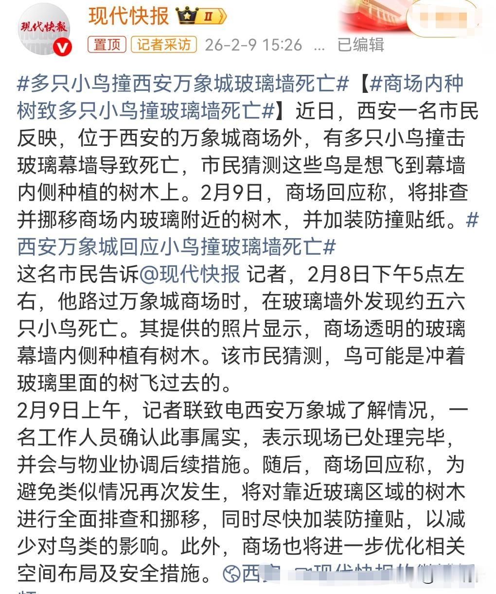 这真是太惨了,毕竟小鸟的命也是命啊。近日西安一市民反映。多只小鸟撞西安万象城玻璃墙死亡。 那这肯定要整改了,要不然会有源源不断的鸟撞玻璃而死亡。 这个市民估计鸟类是看到玻璃里面有种植的树木,他推测是鸟想停在树上,没想到隔了层玻璃,结果撞死了。 商场方面称会把树挪走,并会贴防撞贴。 也希望商场能够说到做到,别再发生这样的悲剧了。 室内种树那也是挺少见的。