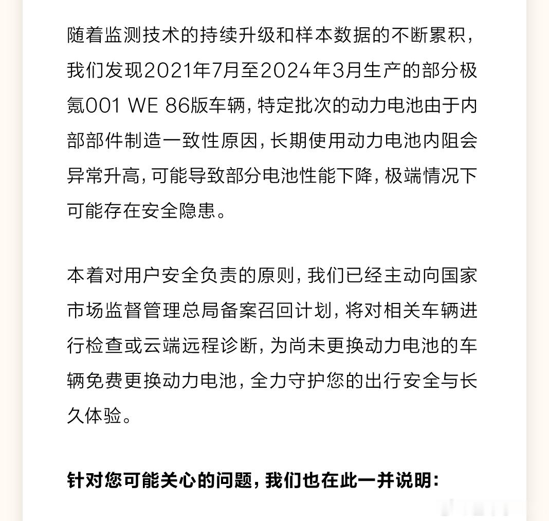 你以为吉利白起诉欣旺达的?2月6日宣布和欣旺达达成和解,2月9日,极氪就对21-24年生产的极氪001we86 欣旺达版本的电池进行召回!这行动力能力也没谁了!老we86车主又秒变新车极氪