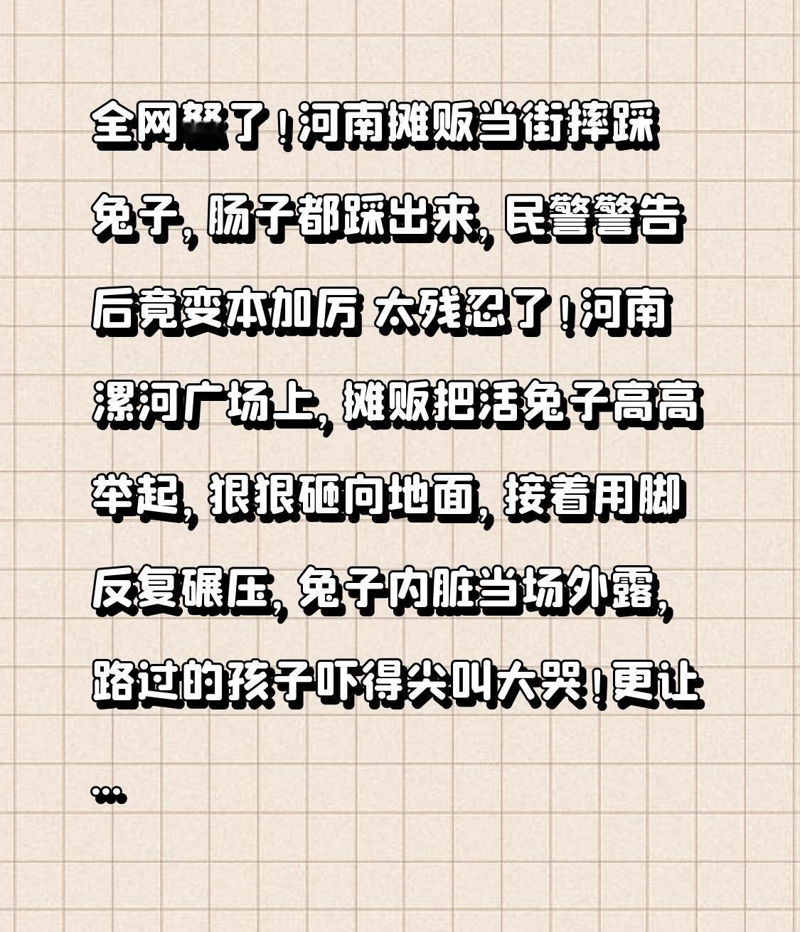 全网怒了!河南摊贩当街摔踩兔子,肠子都踩出来,民警警告后竟变本加厉 太残忍了!河南漯河广场上,摊贩把活兔子高高举起,狠狠砸向地面,接着用脚反复碾压,兔子内脏当场外露,路过的孩子吓得尖叫大哭!更让人愤怒的是,民警到场警告后,他居然变本加厉,又摔死多只兔子,还谎称“兔子拉稀死的”,这波操作直接让全网炸锅:就算是商品,也不能这么践踏生命! 2月8日晚7点,漯河昌建广场的热闹被一阵惨叫打破。目击者吴先生逛街时,突然看到一名卖兔子的摊贩暴怒,从白色箱子里抓出兔子就往地上摔,一次不够还抬脚猛踩,足足踩踏了5次,场面血腥到让人不忍直视。旁边路人看不下去上前劝阻,却被他一把推开,有小朋友看到这一幕吓得躲进家长怀里哭,连大人都觉得浑身发毛。 吴先生当场拨打了报警电话,民警火速赶到后,摊贩却翻脸不认账,辩称“兔子是拉稀死的,不是我摔的”。民警对他进行了警告教育,本以为事情就此平息,可没想到几十分钟后,吴先生收到朋友发来的视频——民警刚走,这名摊贩就像泄愤一样,又从箱子里抓出几只兔子,继续当众摔打,完全没有丝毫悔改之意。 这波“顶风作案”彻底点燃了众怒,吴先生立刻联系民警,把现场照片和视频全部提交作为证据。当晚9点多,民警再次赶到,直接将涉事摊贩带回派出所调查。截至2月9日,当地12345政务热线已经接到多起市民投诉,可派出所暂未透露具体处理结果,网友们纷纷追问:“难道一句警告就完事了?” 其实从法律角度看,虽然目前没有专门的反虐待动物法,但摊贩在公共场所实施血腥暴力行为,扰乱公共秩序、伤害公众情感,已经违反了治安管理相关规定,完全可以依法进行行政处罚。更让人揪心的是,现场不仅有兔子,还有猫、仓鼠等小动物,谁也不知道它们会不会成为下一个受害者。有网友说得好:“买卖可以,但别泯灭人性;兔子是商品,可也是一条生命。” 这起事件让人愤怒的,不只是虐兔的残忍,更是对生命的漠视和对规则的无视。在公共场所做出如此血腥的行为,不仅刺痛了大家的神经,更给孩子留下了心理阴影。我们并非要求人人都爱动物,但至少要守住底线——不虐待、不施暴,这是公序良俗的基本要求,也是人性的底线。 如今大家之所以强烈谴责,是怕弱小生命无人守护,怕暴力行为被默许。希望警方能严肃处理,也期盼反虐待动物相关规定能尽快完善,让这类冷血行为有法可依、有规可管。生命不分大小,尊重每一个生灵,就是尊重我们自己。 你怎么看待摊贩的行为?如果当时你在现场会怎么做?评论区聊聊你的看法,一起为守护生命发声,让暴力无处遁形!