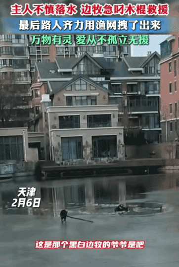 “太有灵性了!”天津,一大爷不慎落水了。突然,他养的边牧叼木棍救他。最后引来路人齐力用渔网把他从水里拽了出来。 天津的冬天是真不好受,风硬得厉害刮在脸上跟针扎似的,河里老早就结了厚厚的冰,一眼望过去,整片河面都是灰白的,看着就结实,谁也没想到这看似坚固的冰层,底下藏着不小的危险,前阵子就在天津一处结冰的河边,发生了一件让人又揪心又暖心的事,直到现在想起来,还忍不住感叹那只狗太有灵性了。 那天天气依旧很冷,河边没什么人,一位身穿黑衣的大爷,大概是想着到河边走走,或者看看冰层的情况,没注意脚下,一不小心就踩破了冰层,整个人瞬间陷进了刺骨的冰水里。 冰冷的河水一下子就没过了大爷的身子,那种寒意可想而知,大爷在水里拼命挣扎,可冰层又滑又脆,根本抓不住借力的地方,只能在水里徒劳地晃动,远远看去,就像冰层上一个小小的黑点,看着格外让人揪心。 周围没什么路人,大爷的挣扎声在空旷的河边显得格外微弱,冰冷的河水还在一个劲地掠夺他的体温,每多待一秒,就多一分危险,就在这危急关头,一道黑色的身影飞快地跑了过来,是大爷平日里养的边境牧羊犬,看得出来,这只狗跟大爷感情很深,是大爷的心头肉。 换做一般的狗,看到主人落水,大概率会急得在岸边狂叫,要么就是一时冲动,不管不顾地往冰水里跳,可这只边牧却做出了让人意想不到的举动,说它有灵性一点都不夸张。 它没有乱叫,也没有盲目地冲进冰窟窿里,大概是知道自己的小身板扛不住,也怕反而给大爷添乱,只见它飞快地扭头,在岸边找了起来,很快就叼起了一根不算粗但足够结实的木棍。 它叼着木棍急急忙忙地跑到冰窟窿旁边,围着冰窟窿不停地转圈,小脑袋来回晃动,眼神里满是焦急,看得出来它是想把这根木棍递到大爷手里,让大爷能抓住这根救命稻草。 它大概不懂什么救援知识,也不知道什么杠杆原理,可它就是凭着本能,凭着对主人的牵挂,做出了最正确的选择,没有蛮干而是找工具帮忙,这份聪明劲儿真的超出了一般的动物本能。 它不停地把木棍往大爷身边递,可大爷在水里挣扎得厉害,加上浑身发冷、力气越来越小,好几次都没能抓住,边牧没有放弃,依旧耐心地围着冰窟窿转,时不时调整姿势,试图把木棍递到大爷更容易抓住的地方,那股认真又焦急的模样,让人看了心里又暖又酸。 好在天无绝人之路,就在这时三位路过的大哥碰巧看到了这一幕,看到水里挣扎的大爷和岸边焦急递木棍的边牧,二话不说就冲了过来,这三位大哥脑子很清醒,知道冬天的冰水温极低,盲目跳下去救人,不仅救不了大爷,很可能自己也会陷进去,酿成更大的悲剧,所以他们没有贸然行动,而是迅速在岸边搜寻可用的救援工具。 运气还算好,他们在岸边不远处找到了一张渔网,这渔网比边牧叼来的木棍管用多了,面积大,大爷更容易抓住,而且受力均匀,几个人一起发力,也能更稳妥地把大爷拉上来三位,大哥分工明确,有人拿着渔网,找准角度,猛地一甩,渔网精准地落在了大爷面前的水里。 水里的大爷感觉到身边的渔网,用尽最后一丝力气,死死地抓住了渔网的网纲,不敢有丝毫放松,岸边的三位大哥,紧紧拽住渔网的另一端,像拔河一样齐心协力地往后拖,嘴里默默喊着号子,保持着发力的节奏,生怕力气用偏了,把大爷再甩回冰水里,也怕扯破了渔网。 冰面又滑又硬,几个人拽着渔网往后拖的时候,脚下时不时打滑,可他们没有松手,一直咬牙坚持着,旁边的边牧也停下了递木棍的动作,蹲在一旁眼睛紧紧盯着水里的大爷,时不时对着三位大哥轻轻叫几声,像是在给他们加油,又像是在担心大爷的安危。 经过几分钟的惊心动魄,在三位大哥的齐力拖拽下,大爷终于被慢慢拖离了那个吞噬生机的冰窟窿,成功救上了岸,刚被救上来的时候,大爷浑身湿透,冻得瑟瑟发抖,连站都站不稳,踉踉跄跄地想试着起身,却好几次差点摔倒。 就在这时那只边牧又凑了上前,用自己的头顶住了大爷的腰背,小小的身子用尽全力,帮大爷稳住身形,它不是在撒娇也不是在求大爷夸奖,而是感觉到了大爷的虚弱,想用自己那点微薄的力量,给大爷搭一把手,确认大爷能站稳。 看到这一幕不管是救人的三位大哥,还是后来闻讯赶来的人,都忍不住感叹,这只边牧太有灵性了,它哪里是一只宠物,分明是把大爷当成了最重要的人,拼尽全力守护着,这个寒冷的冬日,因为这只灵性的边牧,因为三位热心的路人,让一场可能发生的悲剧,变成了暖心的瞬间,也让我们看到了跨物种的忠诚,和陌生人之间的善意。