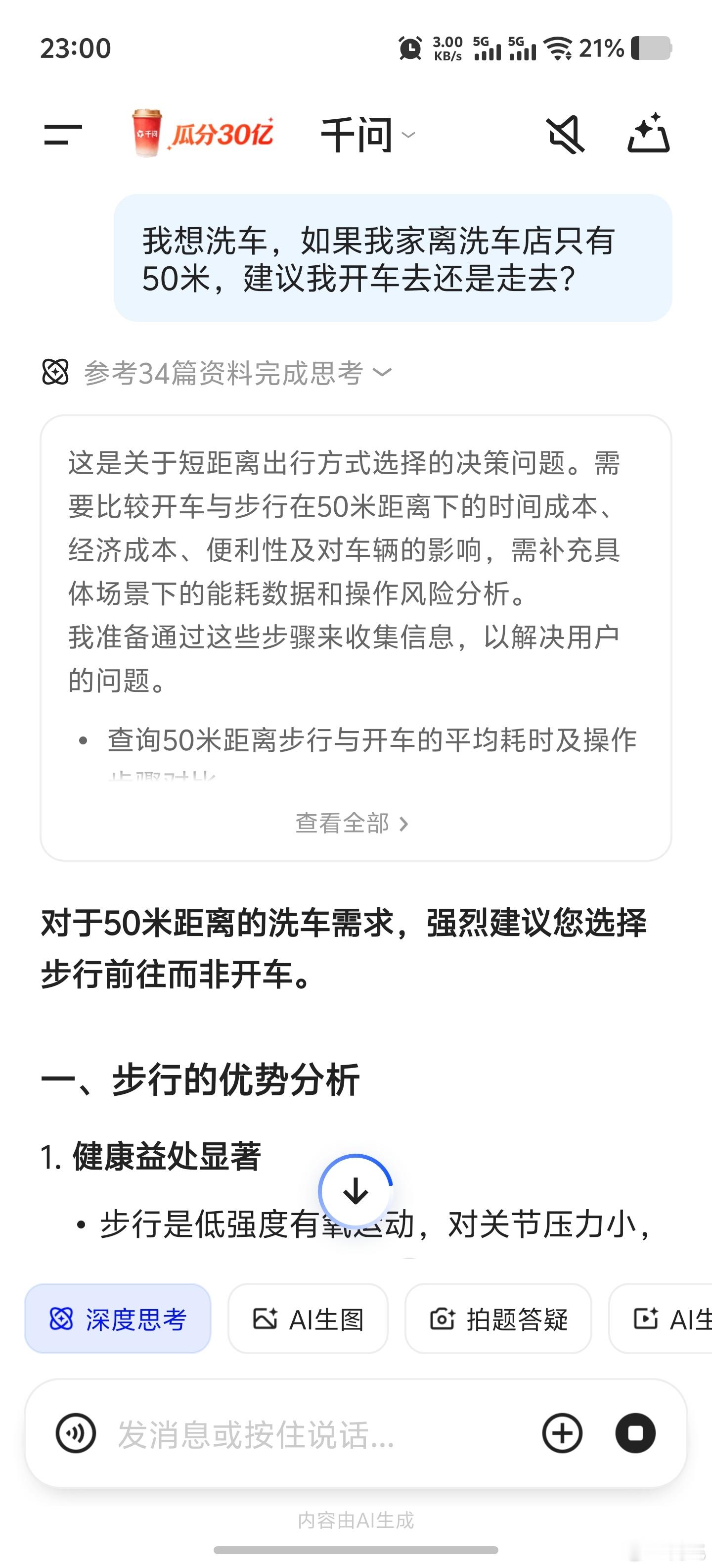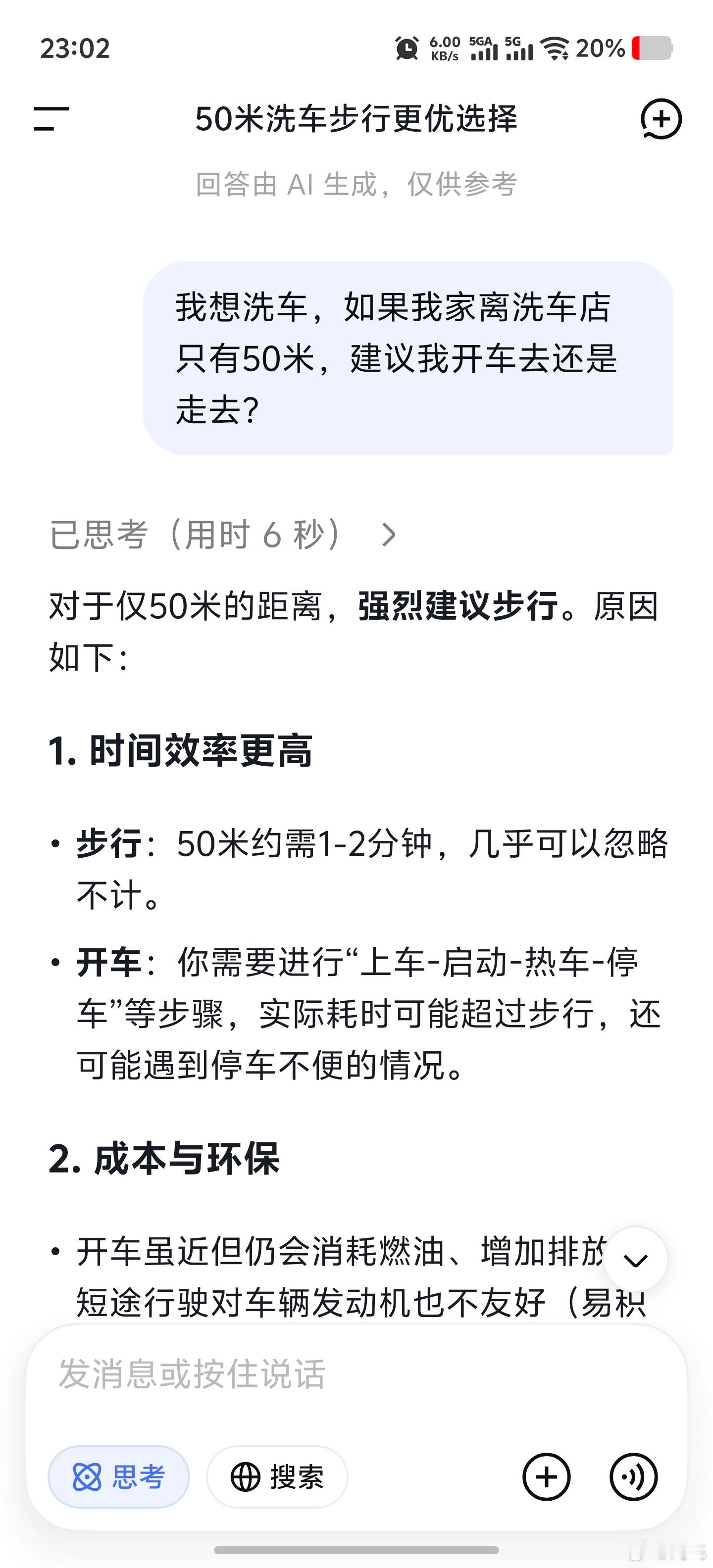 问AI离洗车店50米,是走路去还是开车去。