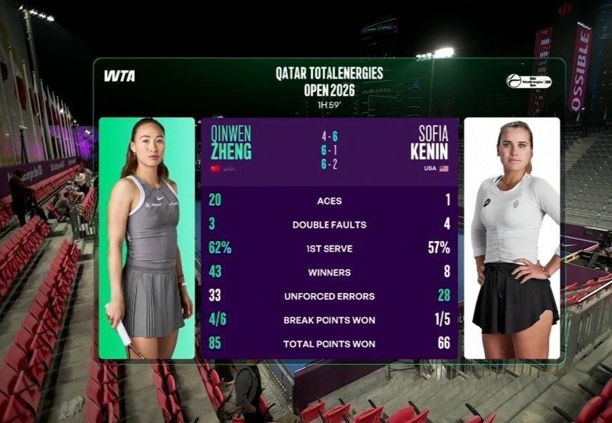 郑钦文复出首秀20记ACE 20记ACE,这大概是2026赛季开始以来单场最多ACE的比赛了,一发成功率62%,一发得分率85%,43个制胜分,是比较完美的比赛数据了。郑钦文逆转前澳网冠军