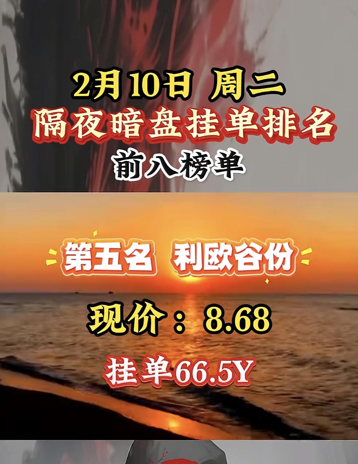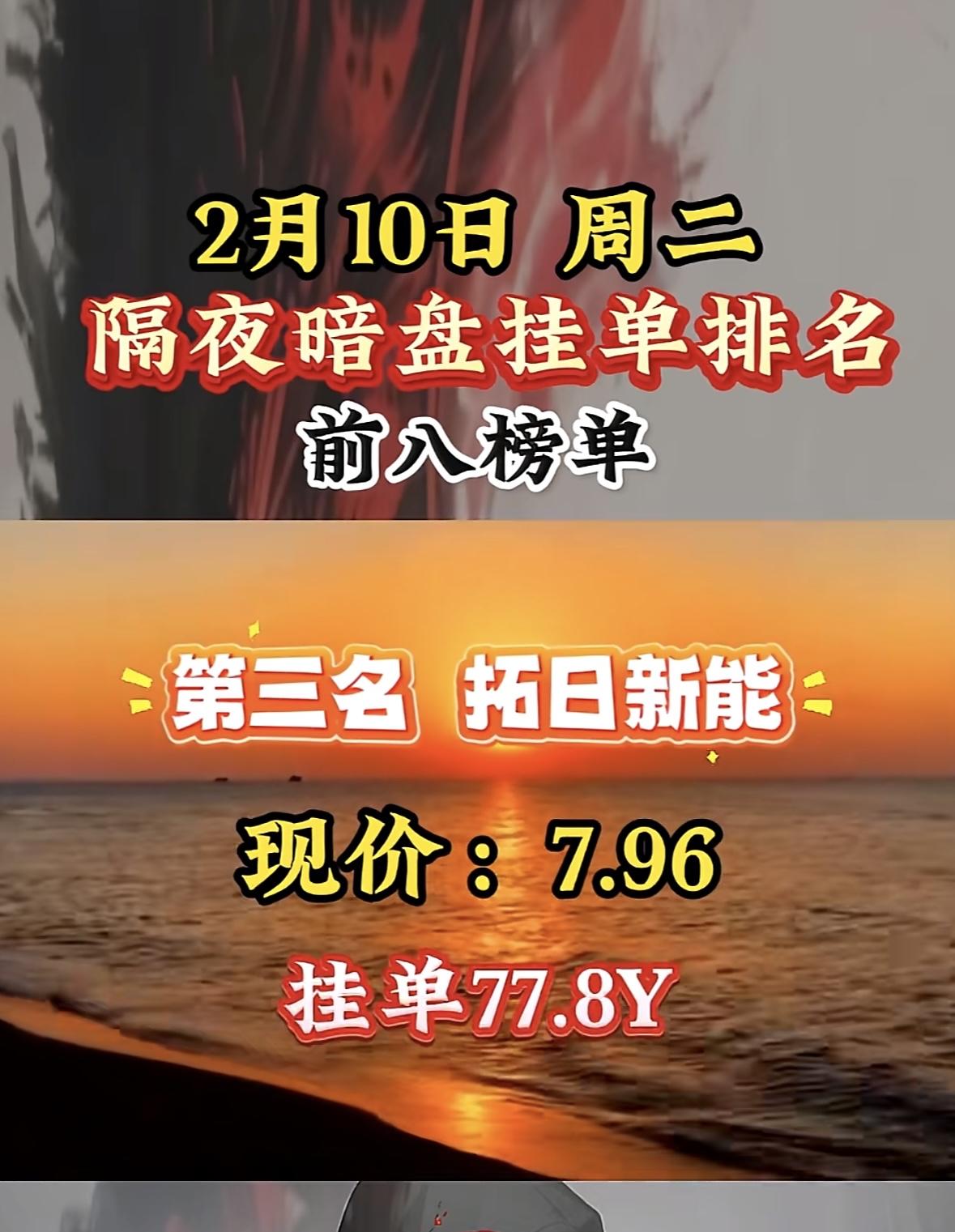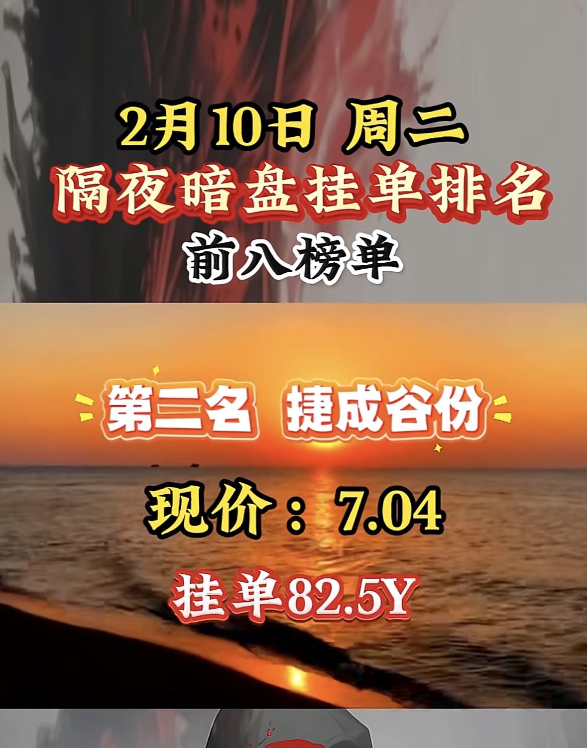 2月9日暗盘隔夜挂单捷成股份:隔夜暗盘挂单榜第三名,现价7.04,挂单82.5Y "巨力索具上榜暗盘前十,挂单活跃现价近20元。"