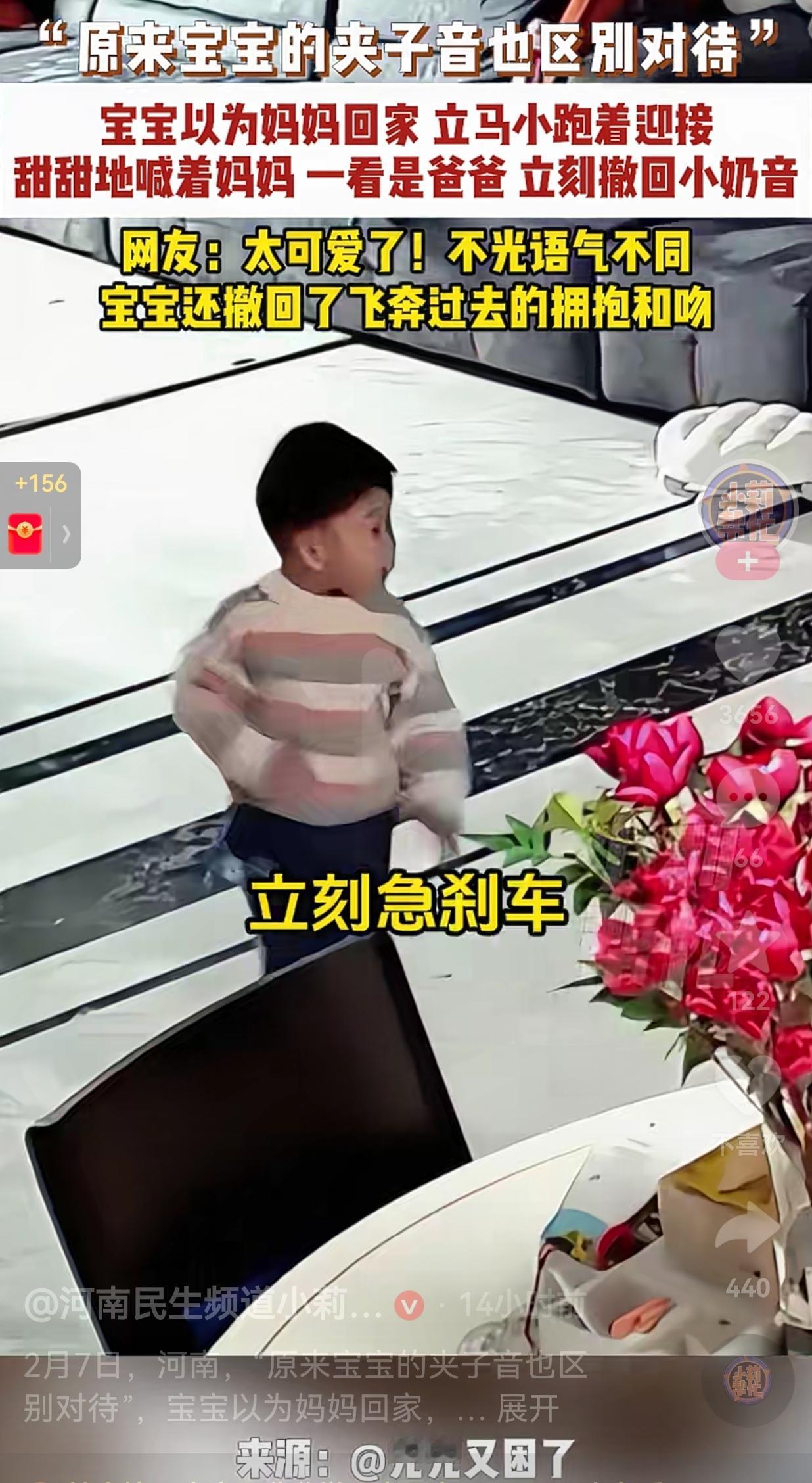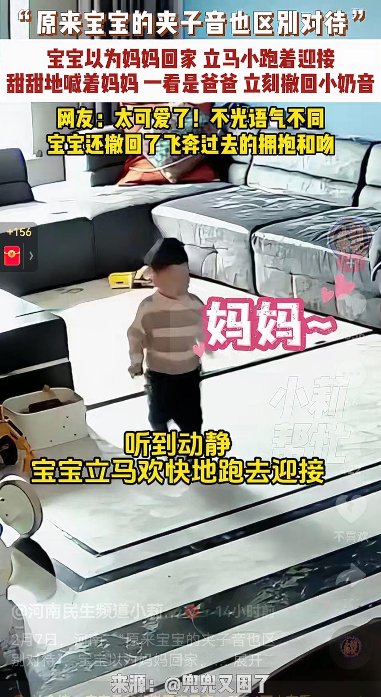 这区别对待也太明显了吧!2月7日,河南一男子下班回家了,男子回来的时候有声音,家里的小不点以为是妈妈回来了,小短腿倒腾得飞快,奶声奶气拖长音喊“妈妈~”,那声音甜得能掐出蜜来,连跑带颠儿地扑过去要抱要亲。 爸爸听到后,赶紧回答:“儿子,怎么了?” 结果小不点听到是爸爸的声音再仔细一看,确实是爸爸。 宝宝当场来了个急刹车,脚步钉在原地,小脑袋一歪,看清来人的瞬间,刚才的夹子音“唰”地收了回去,语气平得像白开水:“爸爸……” 然后,他连刚才伸出去的胳膊都收了回来,转身就往屋里走,那背影写满了“算了,凑活喊一声吧”。 爸爸看到被区别对待了,还在那里重复儿子的话,心里的酸,隔着屏幕都能感受得到。 这段视频一出来,评论区直接炸了。有人说:“这哪是双标,这是精准投放啊!对妈妈是撒娇小奶猫,对爸爸是敷衍小大人。” 还有人补刀:“不光语气变了,连飞奔过去的拥抱和吻都撤回了,这孩子是懂止损的。” 很多人看了之后,可能会觉得这个孩子太现实,可我倒觉得,这才是小孩子最纯粹的表达。 他们不会装,喜欢谁、依赖谁,全写在脸上、挂在声音里。 对妈妈的夹子音,是因为知道妈妈会温柔地抱他、亲他、听他碎碎念。 对爸爸的敷衍,是因为爸爸总爱逗他、抢他玩具、还会把他举得老高吓他一跳。 宝宝的反应,不是不爱爸爸,只是在孩子的小世界里,妈妈是代表了安全,而爸爸,更像一个可以一起疯的玩伴。 就像视频里的宝宝,看见爸爸虽然没扑上去,但还是喊了一声“爸爸”。我家娃虽然转身玩积木,但过了一会儿,还是会举着积木跑过来跟我说“爸爸你看,我搭的高楼”。 孩子对父母的爱,从来都在,只是表达方式不一样。 话说,你家娃见你和另一半的反应有区别吗?如果有的话,孩子是怎么表现的呢?