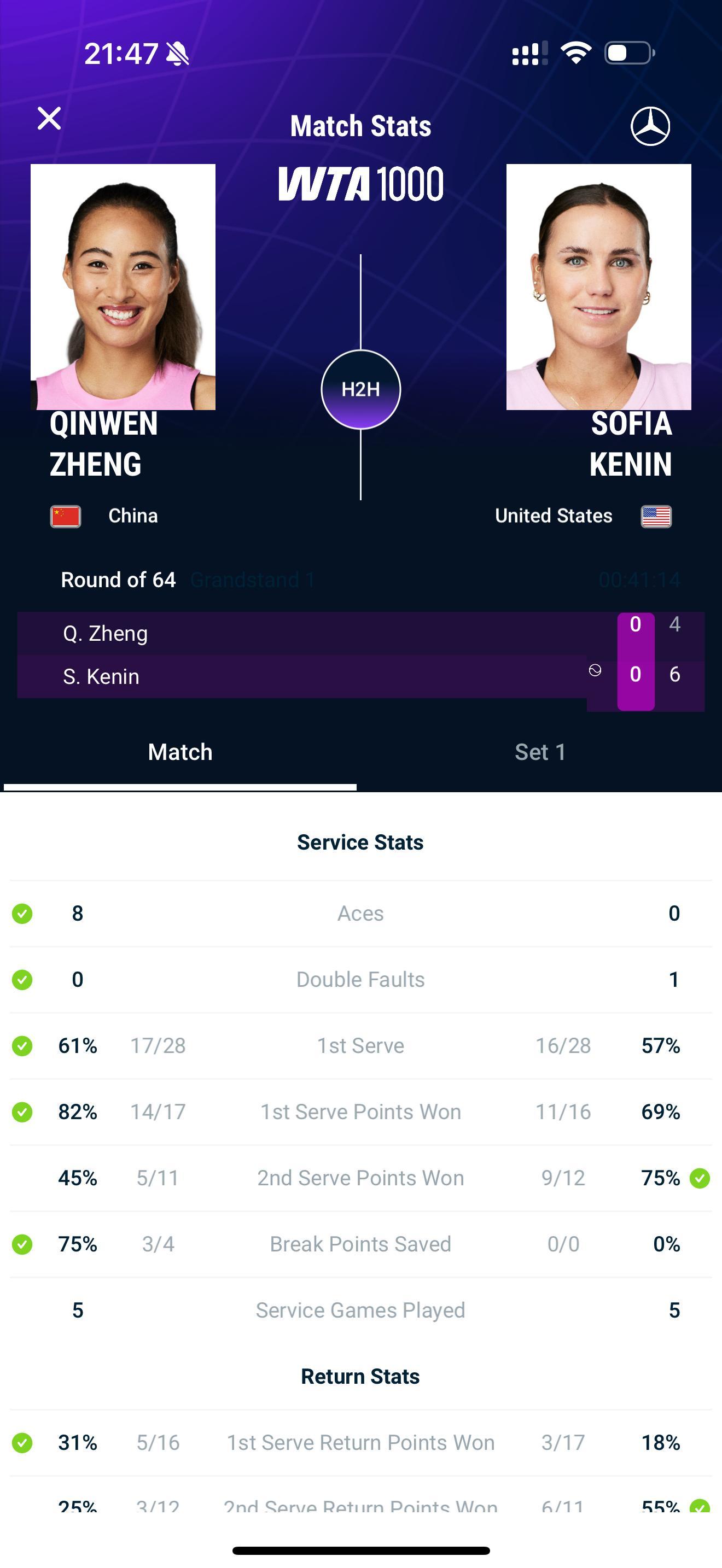 郑钦文vs肯宁 首盘4比6肯宁,比赛进行到现在,郑钦文的数据看起来很不错,8个ACE球,一发进球率超过60%,一发得分率高达82%,很不错的数据,第二盘加油!