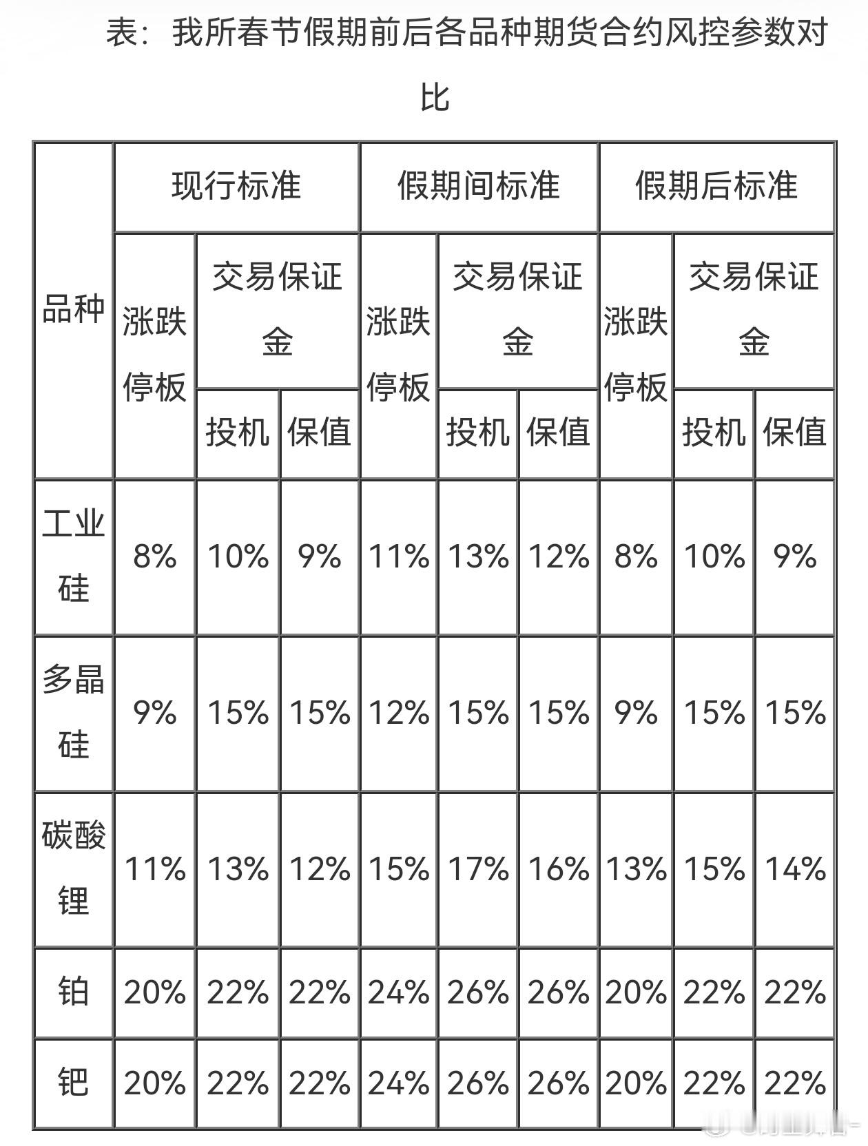 广期所春节假期前后各品种期货合约风控参数对比(保证金、涨跌停板)期货