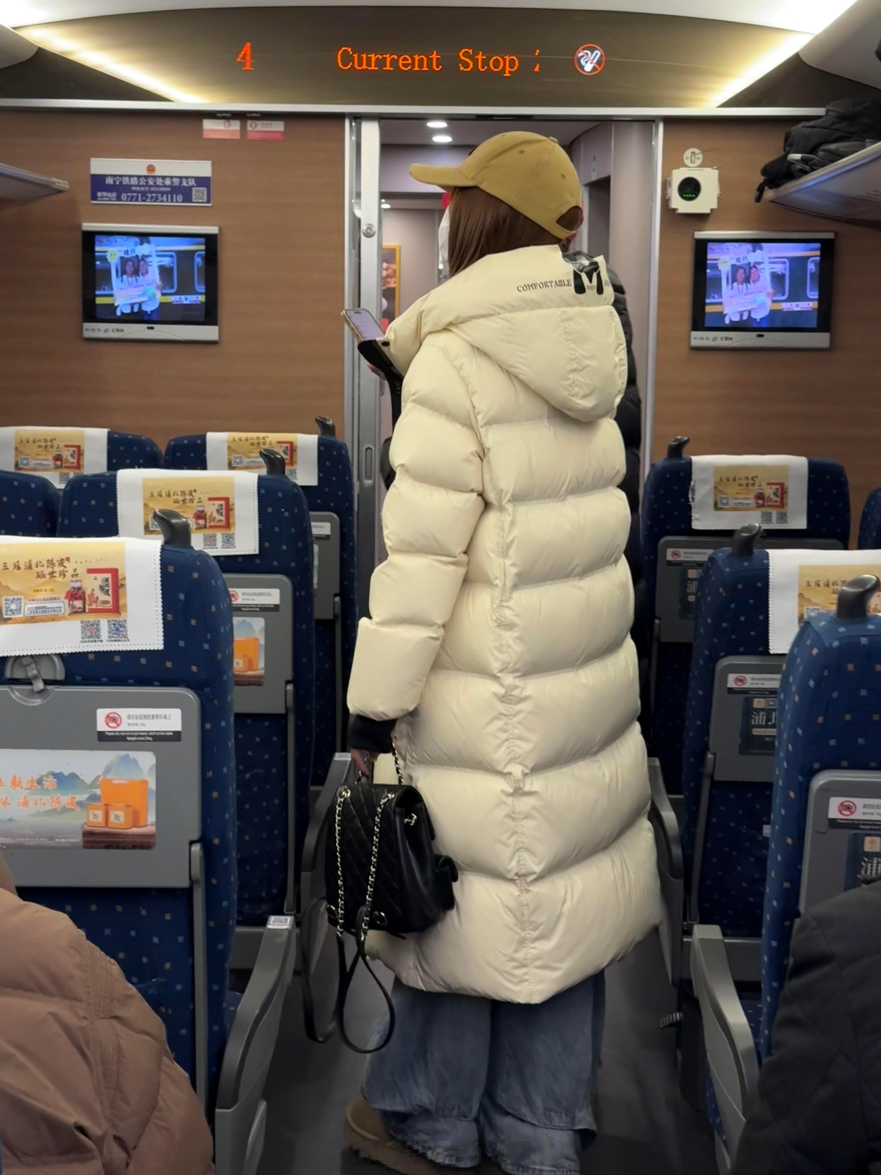 wok!第一次get到了长款羽绒服的含金量!高铁上一眼就喜欢上了,现实生活长款羽绒服显得还是很有质感的呀,尤其是白色羽绒服看起来很有质感,而且看着好厚版型很洋气啊!好想拥有同款啊啊啊啊