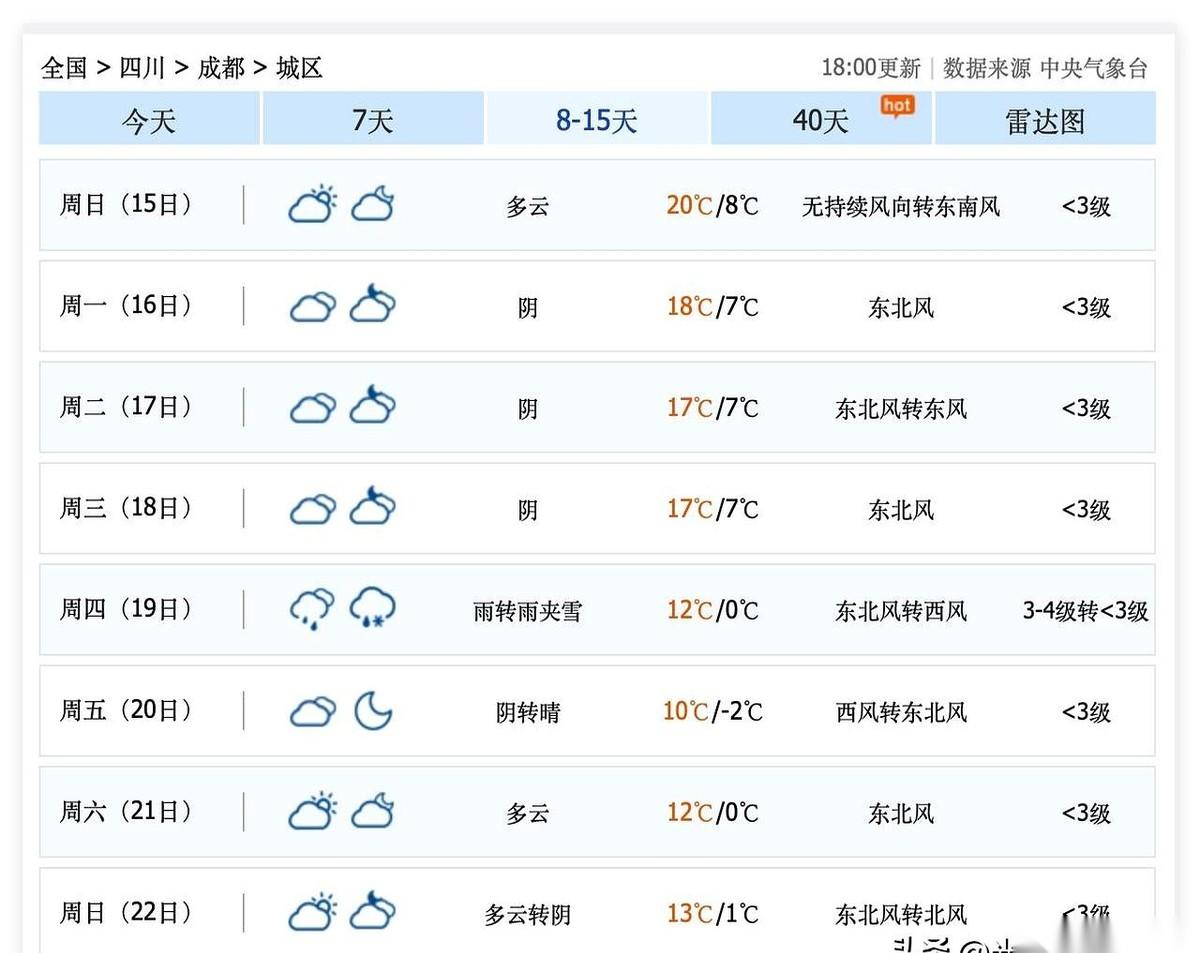 成都这天气,准备跟所有人开个大玩笑。 前脚刚用直逼20度的太阳,把你的厚外套骗进衣柜,让你恍惚以为春天已经来了。街上喝茶的,晒太阳的,个个都舒展开了。 但你先别急着高兴。从9号到18号,这一连串的大晴天背后,藏着个麻烦。风停了,雨也不下,整个盆地的空气就像一锅温吞水,越来越闷。尤其是到了15、16号,推开窗户,外面可能就是灰蒙蒙一片。 就在你琢磨着周末去哪儿踏青,连春装都盘算好的时候,天气已经悄悄准备好了一记响亮的耳光。 19号,大反转来了。 一股冷空气直接冲下来,气温从接近20度,一个猛子给你扎到0度。一秒钟,把你从暖春直接踹回寒冬。天上飘下来的,可能就不只是雨了,直接给你换成雨夹雪套餐。 也好,这一场透心凉,正好能把之前闷了快十天的空气,给你洗得干干净净。 说白了,这就是先给你一颗糖,再狠狠抽你一巴掌。你说这到底是“春天体验卡”,还是“冬天回马枪”?
