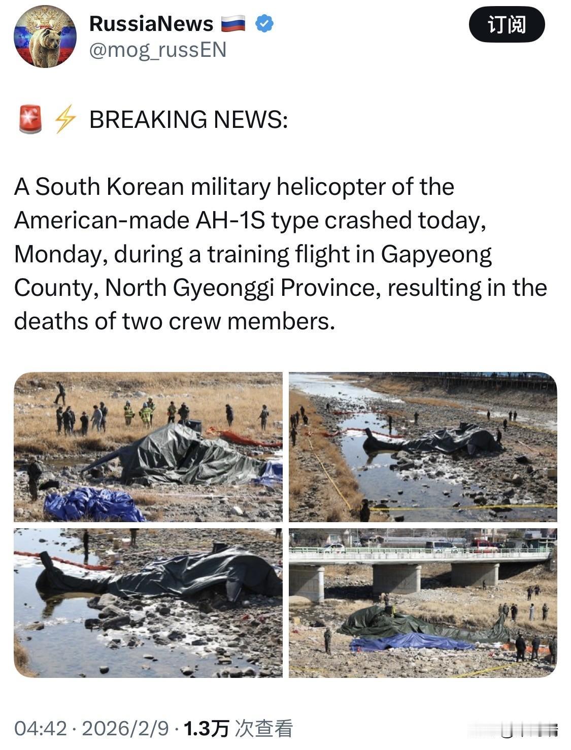 根据韩联社 (Yonhap)及新华社的最新报道,当地时间 2026年2月9日(星期一) 上午,韩国陆军一架美制 AH-1S“眼镜蛇” 武装直升机在执行任务时不幸坠毁。 事故时间与地点:直升机于上午 9:45 起飞执行训练任务,11:04 左右坠毁在 京畿道加平郡 (Gapyeong) 朝宗面岘里附近的一处溪边。 伤亡情况:机上共有两名机组人员,军衔均为 准尉 (Warrant Officer)。两人在被发现时已处于“心跳停止”状态,紧急送医后确认不治身亡。 训练内容:当时直升机正在进行 紧急程序飞行训练(模拟技术故障条件下的紧急着陆和自旋降落练习)。 军方反应: 停飞指令:韩国陆军已下令 暂停所有同型号 AH-1S 直升机 的飞行任务。 事故调查:事故现场未发生爆炸或火灾,也未造成地面人员伤亡。军方已成立“事故对策本部”,正通过回收机上的记录设备调查具体坠毁原因。 背景资料:此次坠毁的 AH-1S 直升机于 1991 年投入服役。韩国陆军目前拥有的该系列直升机机龄普遍超过 30 年,原本计划于 2028 年至 2031 年间逐步退役,由国产轻型武装直升机取代。