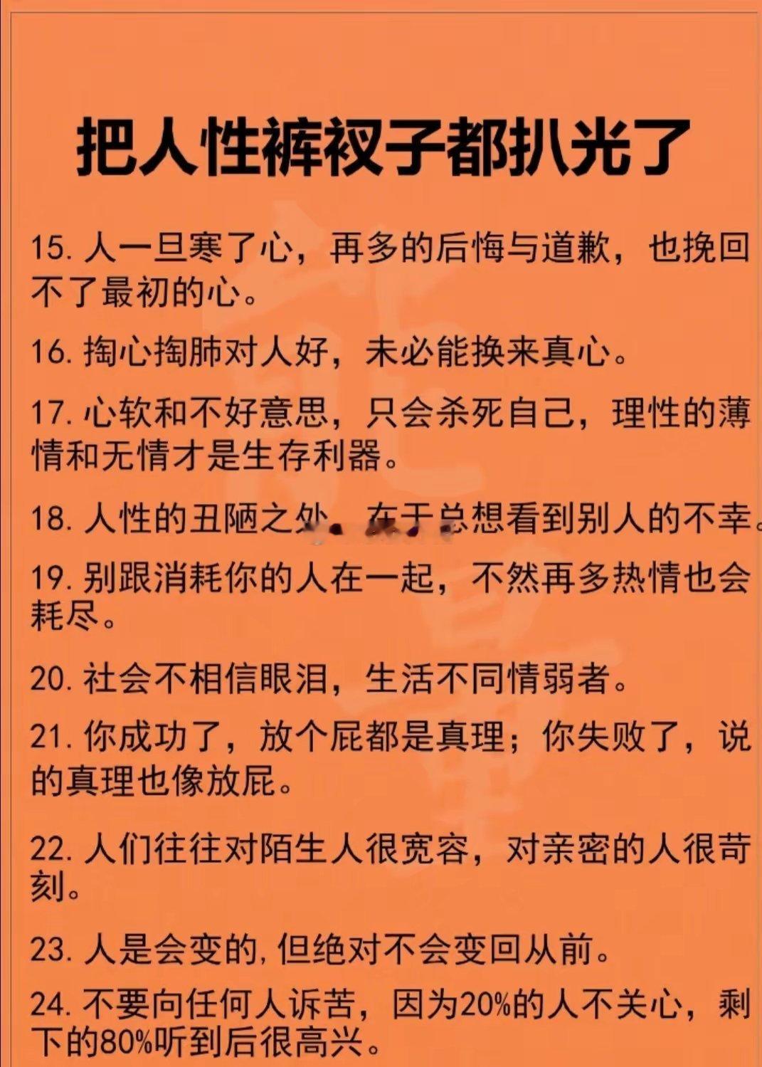 扎心又真实的人性真相,看完瞬间清醒这些话虽然赤裸扎心,却道尽了成年人世界的生存真相:朋友越少反而日子越稳,没钱时连说话都没分量,利益面前人人都是“演员”;人穷莫入众,位卑莫劝人,落魄时才能看清身边人心;心软和不好意思是自我消耗的毒药,学会拒绝、理性薄情才是保护自己的铠甲。这24条人性写实,没有鸡汤,只有现实。句句戳破虚伪,让人瞬间清醒。