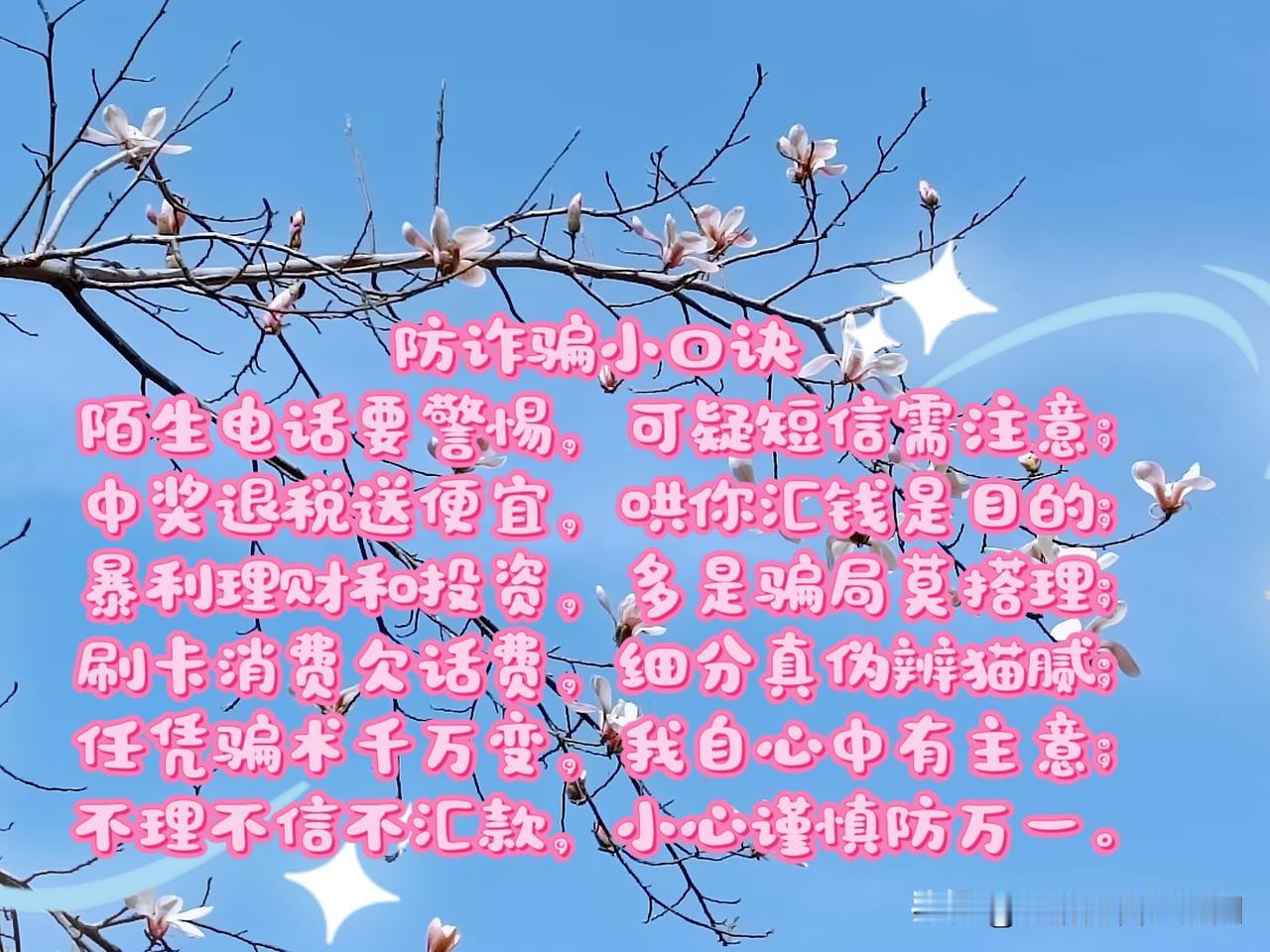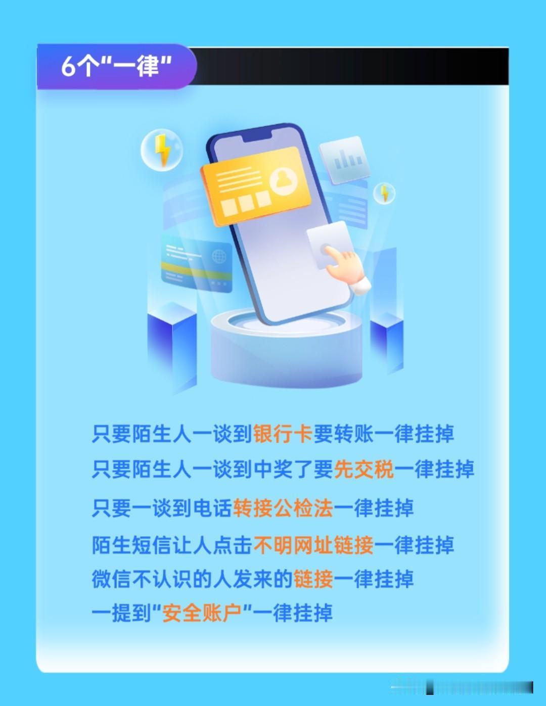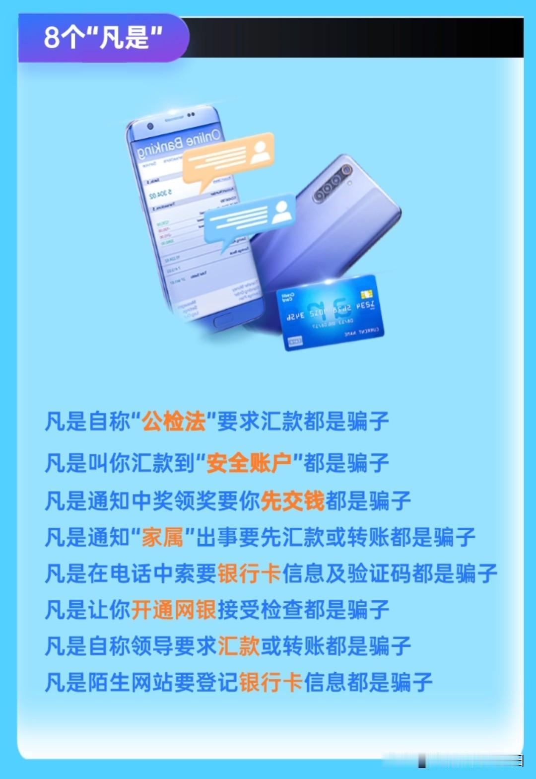 来看看我们村里群发的提醒 现在骗子的花招越来越多,专门盯着咱们过年手里有点钱的时候下手。冀法通把最关键的内容给大家捋好啦,来看看吧: 8个“凡是”(图二),全是骗子套路,看着五花八门,其实万变不离其宗,就是想把你口袋里的钱骗走。6个“一律”(图三),直接照做就行。还有个小口诀,大家多念几遍(图一)。 就像小口诀里说的:“任凭骗术千万变,我自心中有主意。” 不管是电话里的陌生声音,还是微信里不认识的人发来的链接,只要一提到银行卡、转账、验证码,咱们就多留个心眼,先问问家里人,再跟社区领导、派出所的同志核实核实。 大过年的,冀法通老生常谈,不是为了制造焦虑,而是想让大家都绷紧这根弦。咱们辛辛苦苦攒了一年的钱,可不能让骗子几句话就哄走了。愿大家都能守住钱袋子,过个安心年、踏实年。 新型骗钱套路 无孔不入的骗术 套路骗术