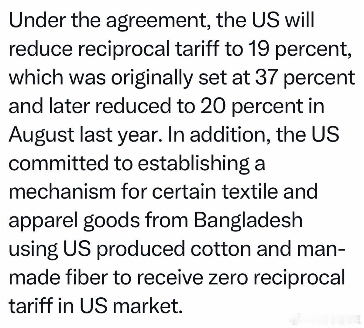 孟加拉承诺大量进口美国棉花等原材料,美国承诺用🇺🇸原料织物做的衣服免税