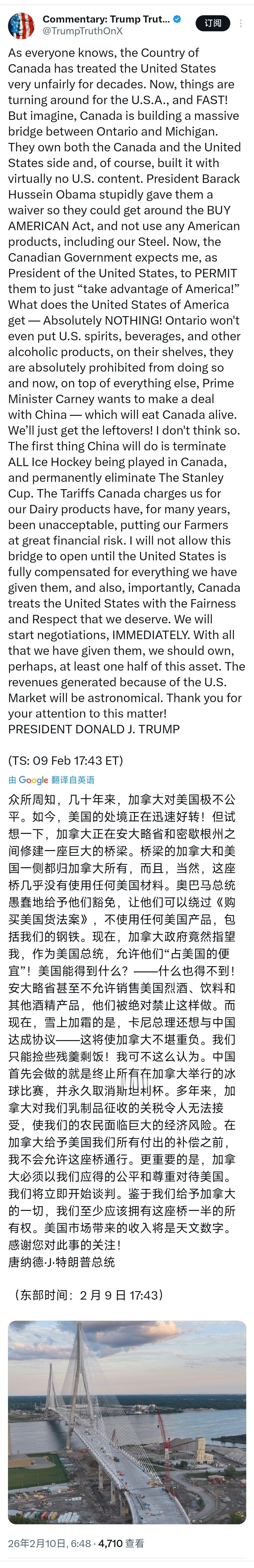 特朗普今天(北京时间2月10日)发文写道:“众所周知,几十年来,加拿大对美国极不公平。如今,美国的处境正在迅速好转!但试想一下,加拿大正在安大略省和密歇根州之间修建一座巨大的桥梁。桥梁的加拿大和美国一侧都归加拿大所有,而且,当然,这座桥几乎没有使用任何美国材料。奥巴马总统愚蠢地给予他们豁免……现在,加拿大政府竟然指望我,作为美国总统,允许他们‘占美国的便宜’!美国能得到什么?什么也得不到!安大略省甚至不允许销售美国烈酒……而现在,雪上加霜的是,卡尼总理还想与中国达成协议这将使加拿大不堪重负。我们只能捡些残羹剩饭!我可不这么认为。中国首先会做的就是终止所有在加拿大举行的冰球比赛……在加拿大给予美国我们所有付出的补偿之前,我不会允许这座桥通行……鉴于我们给予加拿大的一切,我们至少应该拥有这座桥一半的所有权。美国市场带来的收入将是天文数字。” [机智]评几句:特朗普此番针对加拿大的发文,尽显背信弃义与霸权蛮横,正以极端短视的做法,对美加关系造成难以修复的代际性损害。加拿大已出资64亿美元推进既定桥梁项目,完全遵循此前达成的协议,特朗普却公然撕毁共识,强行索要一半所有权,将契约精神抛诸脑后,把盟友关系当成予取予求的生意。他动辄以封锁通行相威胁,编造莫须有指责,本质是把经贸与基建议题武器化,用霸凌手段逼迫盟友让步,彻底摧毁了北美互信的根基。 此外,特朗普亲手谈判并签署《美墨加协议》,还曾高调吹捧为“史上最出色贸易协定”,如今却全盘推翻、推卸责任,把问题甩给加拿大、奥巴马、中国,甚至牵强扯上冰球,唯独不肯正视自身决策的失误。这种出尔反尔、诿过于人、事后报复的极端领导作风,毫无诚信与担当可言。他的表演只会让国际社会看清美国的不可信与不可靠,让所有盟友警醒:与这样的美国打交道,协议不值一文,承诺形同废纸,所谓伙伴关系,不过是随时可被牺牲的筹码。