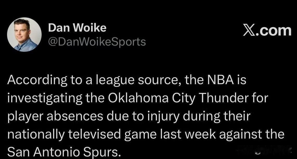 违规轮休?雷霆队被调查了! 据NBA权威记者Dan Woike报道:联盟正在调查上周雷霆队VS马刺队的全美直播比赛中前者大规模球员因伤缺阵的情况。 这场比赛雷霆队仅8人出战,亚历山大、杰伦-威廉姆斯、麦凯恩、米切尔、哈腾、多尔特、霍姆格伦、卡鲁索全部因伤缺阵,基本上宣告放弃了本场比赛。在全美直播的情况下安排如此多的球员休息,这肯定会被联盟调查,如果核实到有违规轮休的情况还会被处以重罚。 在无缘打破勇士队73胜9负的历史记录后,雷霆队开始“彻底放飞自我”,将重心放在了球员健康上,几乎每场比赛都有主力球员因伤缺阵。雷霆队还有更远大的目标,那就是卫冕总冠军。