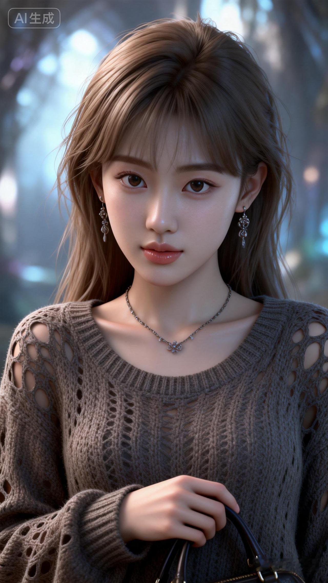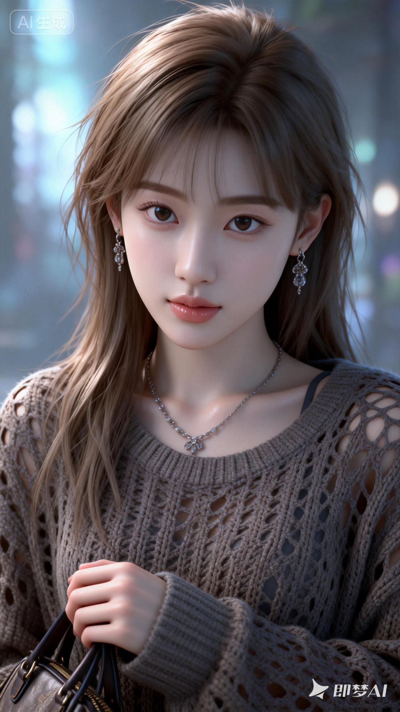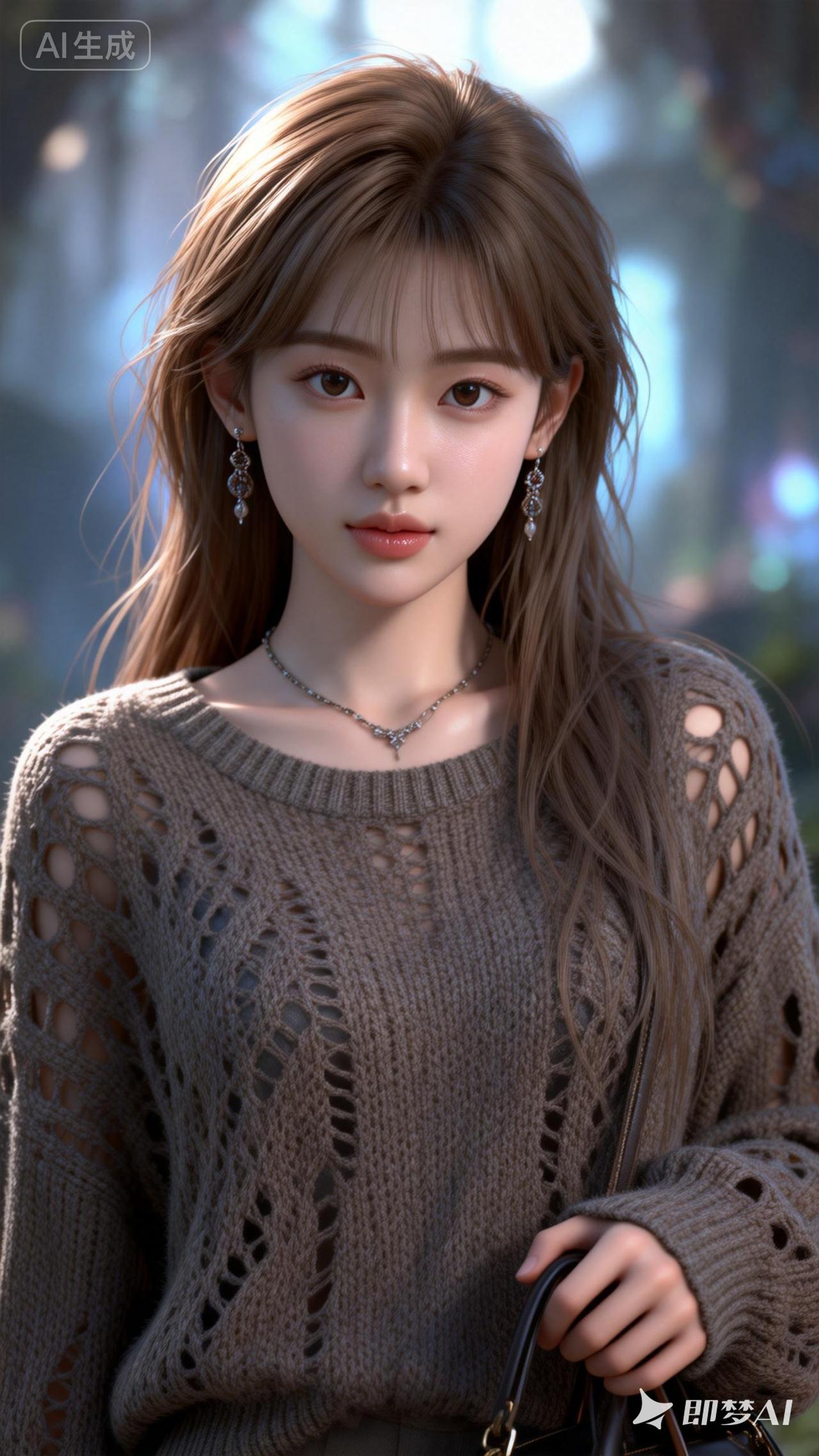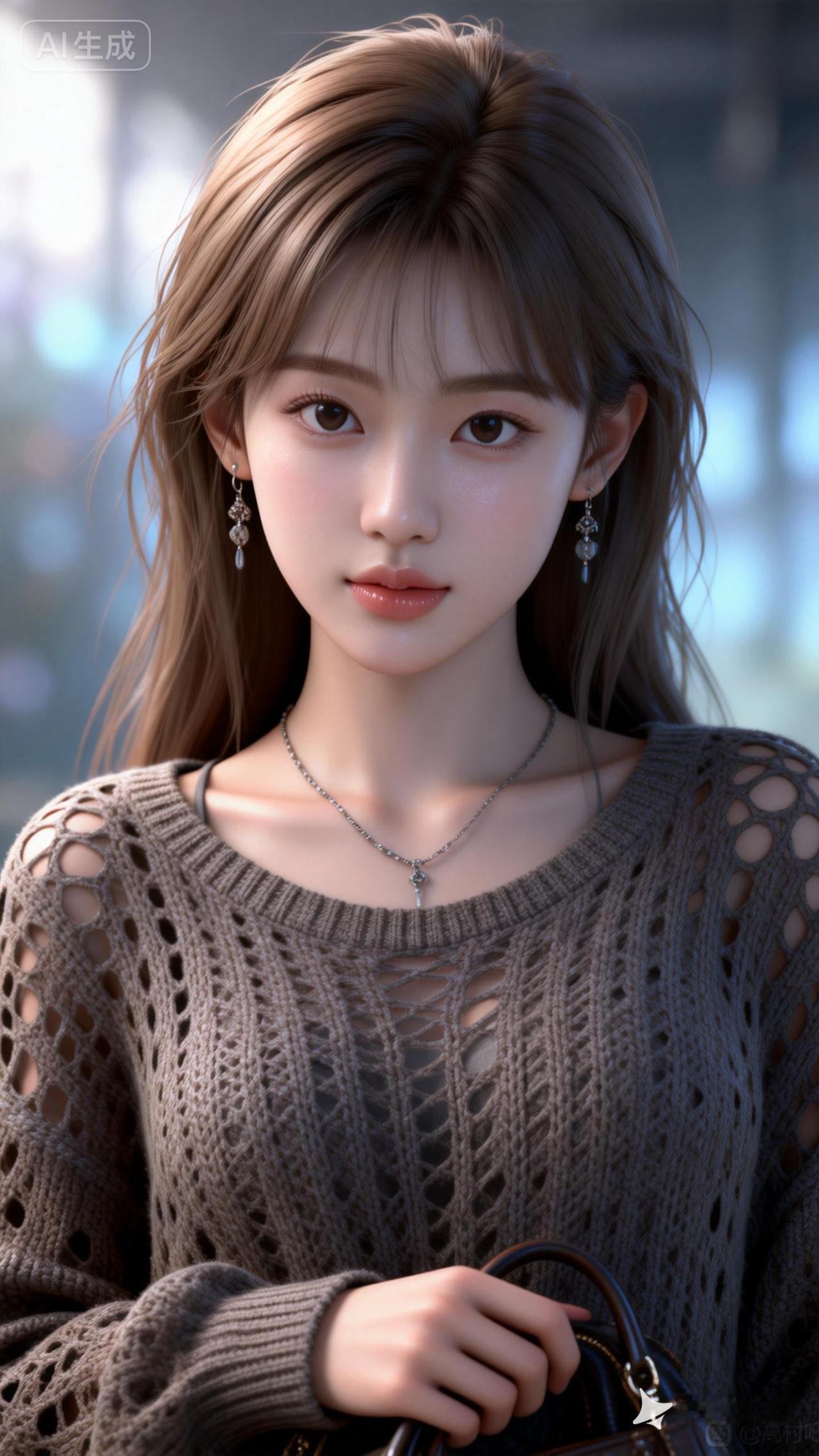 她有着眼尾细长的桃花眼,发丝细腻刻画,披着凌乱的浅棕色长发,是真人比例。有着精致无比的东方面容,似建模脸,化着精致的伪素颜妆。皮肤白皙柔嫩,如陶瓷般光滑,小巧玲珑,小巧的漂亮鼻子,长长的睫毛,精致的柳叶眉,还有皮肤高光