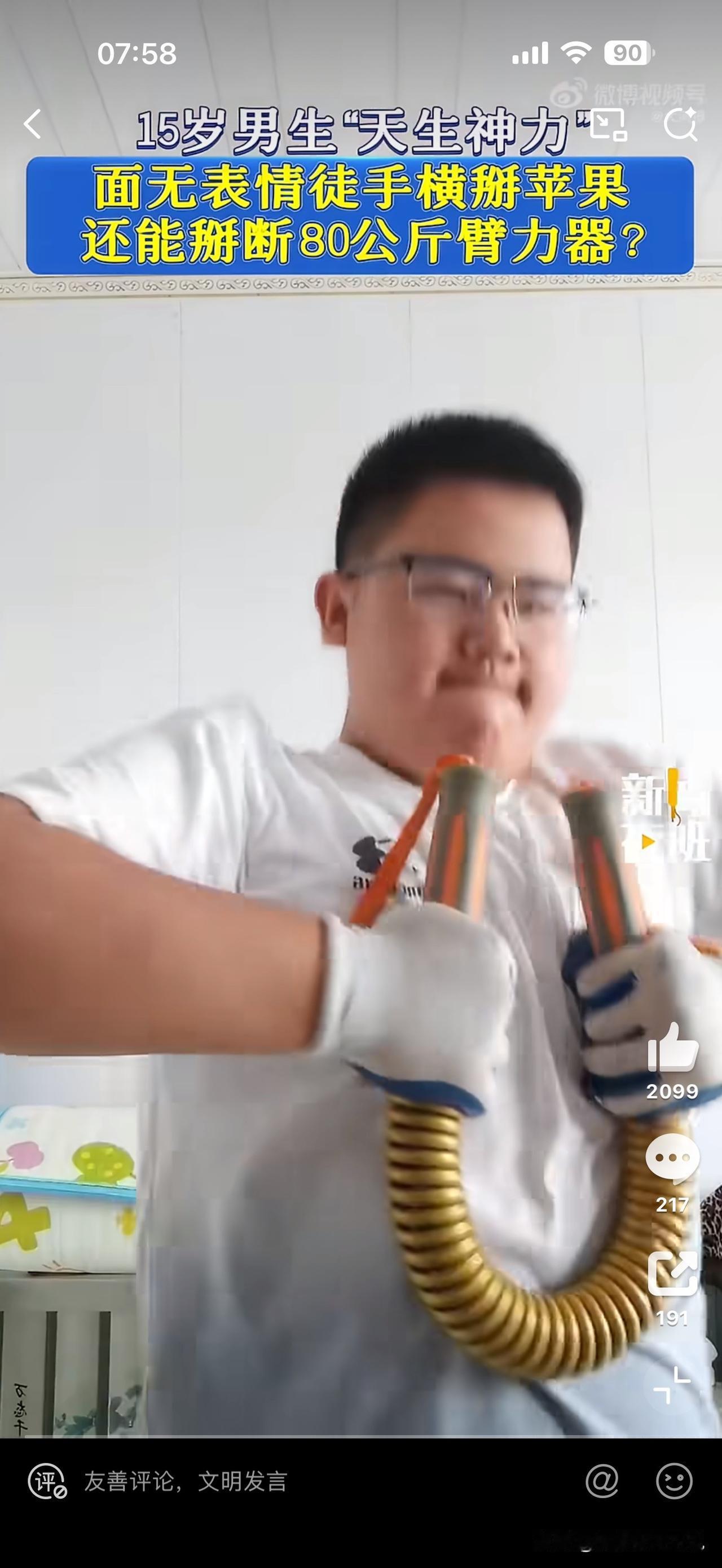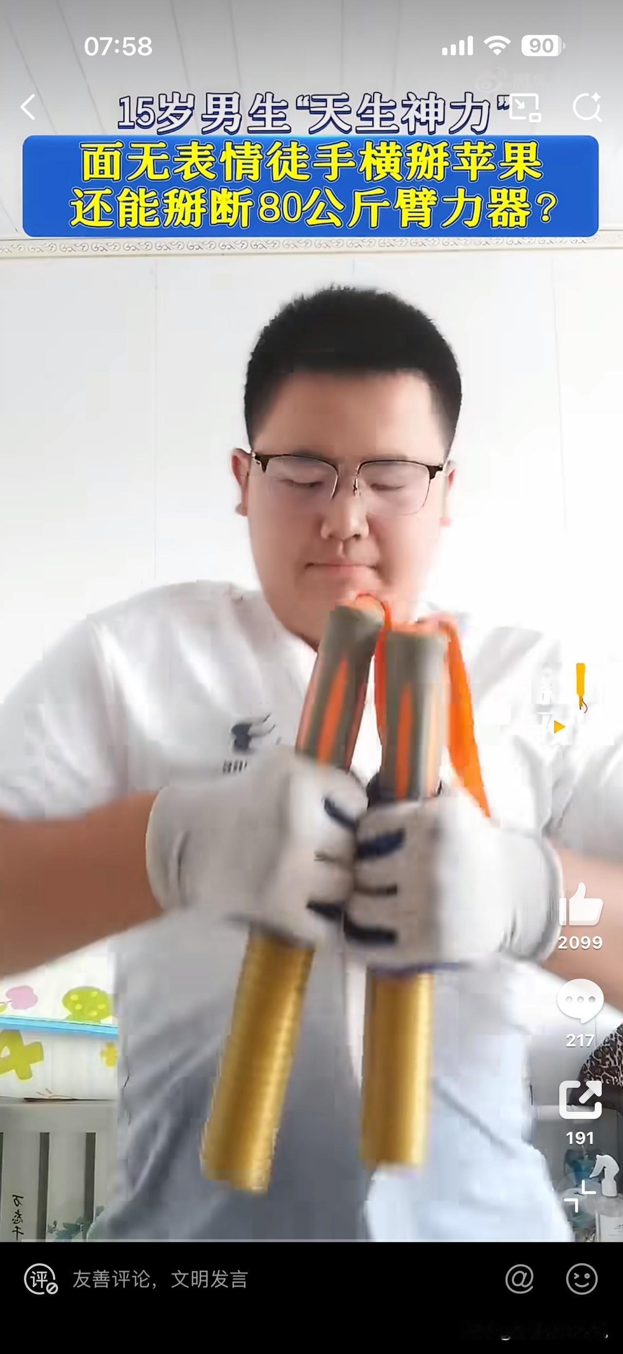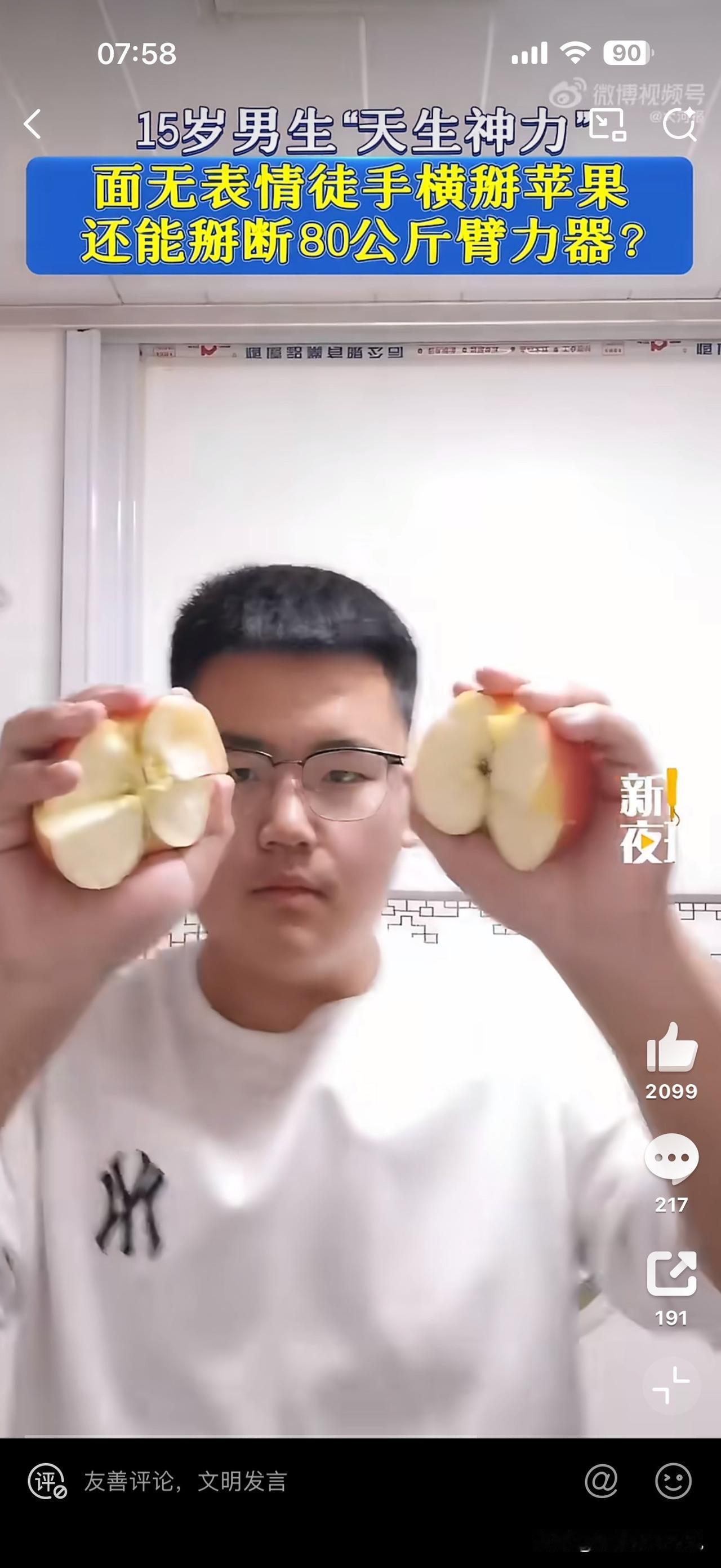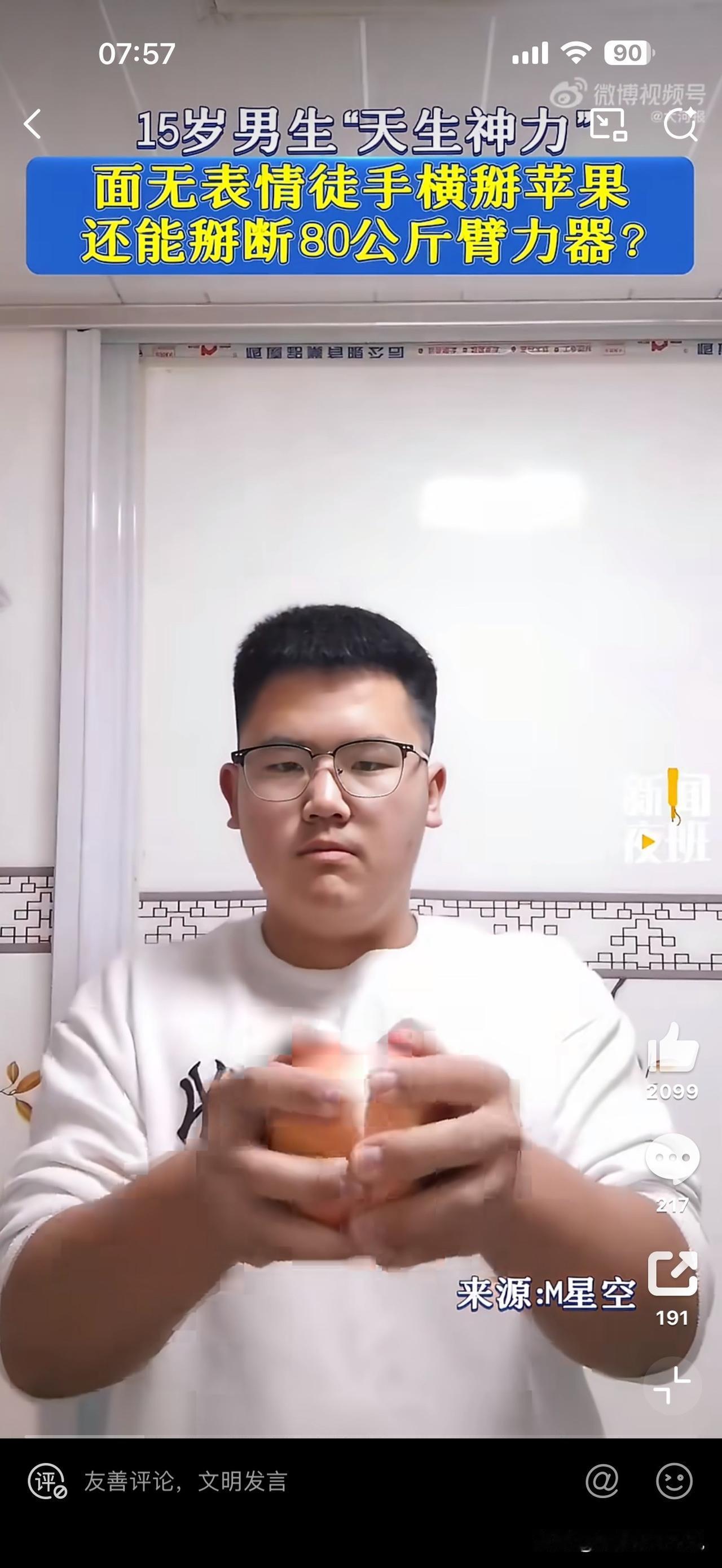 天生神力现代版李元霸来了,辽宁一15岁男生居然 “天生神力”,可以做到面无表情徒手轻松横掰苹果。注意了,这可不是竖着掰苹果,竖着掰我给点劲儿也能勉强做到,而这位少年可是横着掰,就这一手估计就能折服不少人,看人家的表情,比我徒手掰耙耙柑儿都要轻松一万倍。此外,他还能掰断80公斤臂力器。不过从视频上看,臂力器感觉有点儿不真实,80公斤的我是没试过,比他小很多的我是玩儿过的,无论掰成什么弯度都不可能掰断好吧,难道这是特制的臂力器?