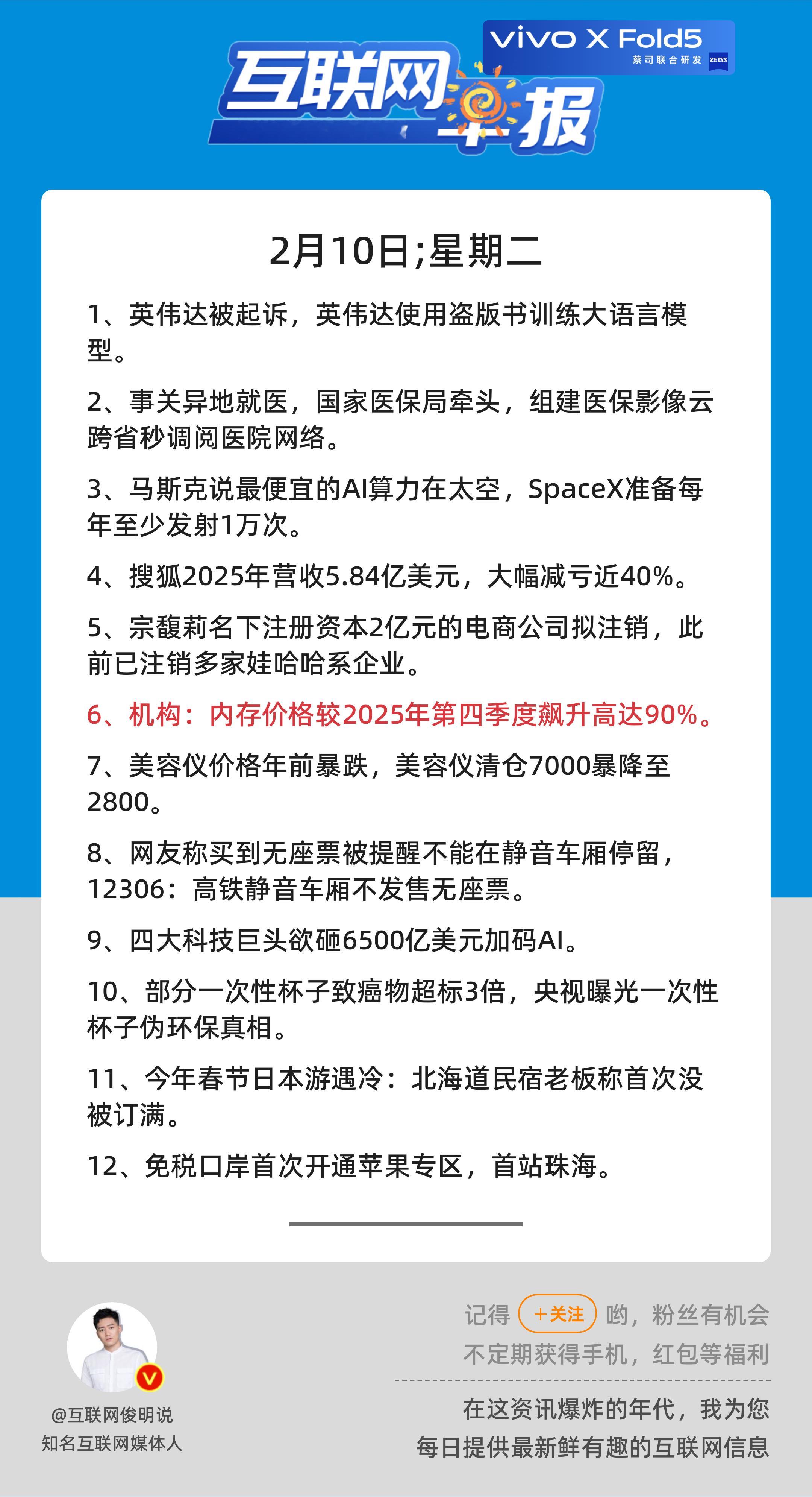 2月10日,星期二,《第3045期》;互联网早报,众览天下事关心第6条:机构:内存价格较2025年第四季度飙升高达90%;早安————————————点击右上方关注每天一分钟众览天下事,互联网早报值得拥有! 更多精彩,欢迎加入粉丝群俊明和他的朋友们