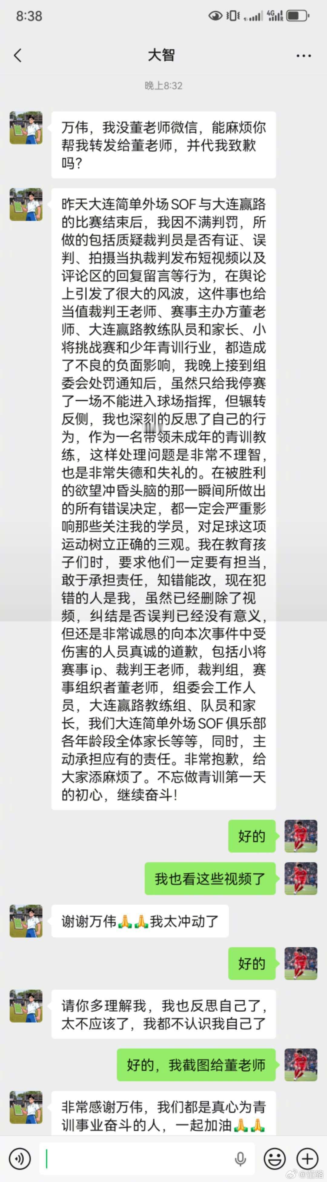 北京时间今天凌晨3:40,昊炎爸从西班牙给我发来昨天赛场风波当事教练的道歉信(对方同步发在个人社媒)我个人接受道歉,并删除相关视频。其他事宜待组委会今天研究决定。