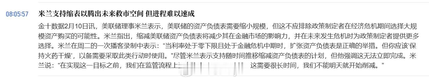 美联储理事米兰表示,美联储的资产负债表需要缩小规模,但这不应排除政策制定者在经济危机期间选择大规模资产购买的可能性。米兰指出,缩减美联储资产负债表将减少其在金融市场的影响力,并在未来发生危机时为政策制定者提供更多选择。米兰在周二的一次播客录制中表示:“当利率处于零下限且处于金融危机中期时,扩张资产负债表是正确的举措。但你应该‘保持火药干燥’,以备需要采取此类行动时使用。”尽管米兰表示支持随时间推移缩减资产负债表的计划,但他强调这无法立即完成。米兰说:“在实现这一目标之前,我们在监管流程上还有许多障碍需要跨越。这需要很长时间,我们不能明天就开始削减。”