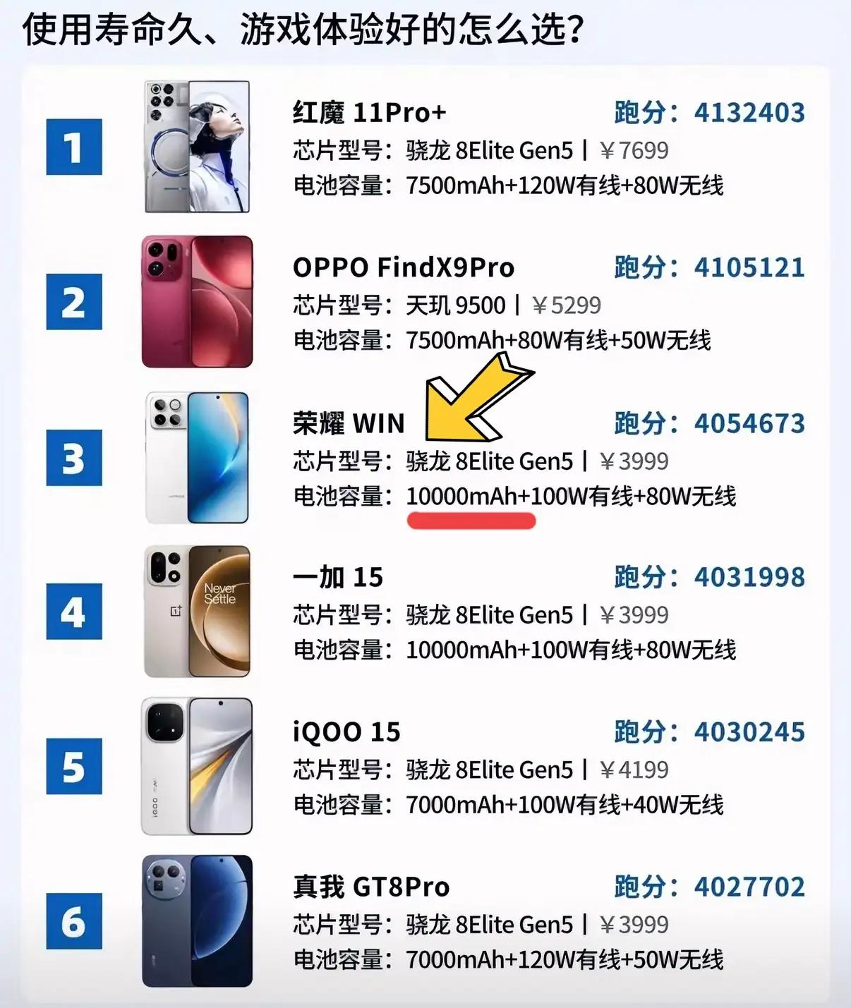 6款高性能游戏手机各有亮点,配置与性价比都很能打。 如果让我选,我更推荐荣耀WIN。 这几款游戏手机都搭载旗舰处理器,性能表现都很出色。 但荣耀WIN在续航上更有优势,配备10000mAh超大电池,续航能力堪比充电宝,轻松满足一整天的使用需求。 再加上主动散热风扇,长时间玩游戏也能保持性能稳定,不卡顿、不降频。 追求大续航+稳性能的游戏玩家,荣耀WIN会是更实用的选择。 你会选哪一款?