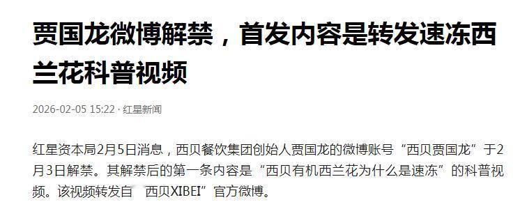 西贝贾国龙微博解禁:再解释2岁冷冻西兰花,新鲜健康好吃又营养! 2月3日,西贝贾国龙的微博可以发文了,他被解禁了。 被解禁的第一天,他又向大家科普了冷冻西兰花,可以说他最大的不平就是冷冻西兰花,认为网友对冷冻西兰花的误解很大。甚至全网公然嘲笑西贝冷冻西兰花,什么2岁宝宝,吃2岁西兰花,西兰花比宝宝的年龄都大。 这种舆论的错误引导,一度让这个西贝最新鲜,最营养,最爆款的菜品,成为了大家讨伐的对象。他要为西兰花正名,这是最健康,最有机,最营养的一个菜,认为是时候揭开误会,让大家了解真相了,大家要正确对待冷冻西兰花。 在这个科普西兰花的视频里,他还把整个西兰花从生长,到冷冻、封袋、锁鲜的整个过程,都给拍摄了一遍,他们选用的是有机西兰花,没有用农药的。 这种有机西兰花,也是山姆和河马超市的首选,他们都是用的同等品质的西兰花,也都是被消费者认可的。而且从切割,到清洗,都是机器完成的,绝对的干净,绝对的没有农药残留,根本就不用农药。 都是大批量机器采摘,生产和加工的。 西兰花的整个生产过程中,工人也会参与进来,他们都穿着消毒的衣服,戴着口罩,卫生是绝对能够保证的,这些工人会对西兰花的品质进行把控,从切割到分拣,到装袋,再到冷冻锁鲜,都会把控到位,保证每一个消费者,都能吃上健康有机的西兰花。 而且这种西兰花,绝对属于是国内餐饮最高等级的食材,也是西贝重推的一款健康,营养菜品。 该款西兰花的保质期写的是两年,但是西贝对西兰花的使用是有要求的,要求进货到门店的西兰花,在一个月内使用完。 也就是说他们店里不存在保质期两年的西兰花,更不存在两岁宝宝吃2岁西兰花这样荒唐的事情,都是最新鲜最营养的菜品,提供给西贝客户。经历了他们的科普,也有一些消费者,意识到之前的错误,又带着孩子来吃了。 罗永浩事件之前,西贝每年能卖出1100万份儿童餐,而且每年都是递增扽,可以说这是很多宝妈对孩子的首选儿童套餐。可是,罗永浩事件之后,宝妈对西贝有误解,很多宝妈不带着孩子来吃了。贾国龙认为,罗永浩应该向全国万千宝妈道歉,宝妈不来吃西贝,这是宝妈和孩子的损失。 也是罗永浩带骗舆论导致的。