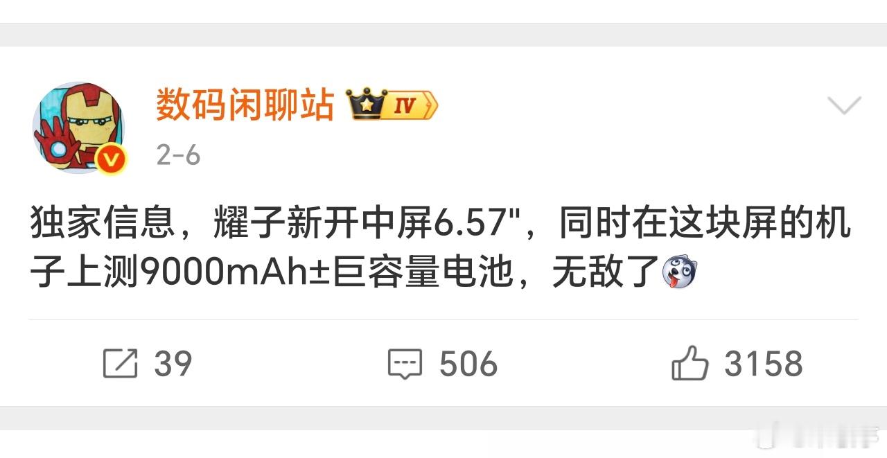 荣耀新开中屏6.57",同时在测9000mAh±巨容量电池,这是荣耀600系列吗?荣耀在大电池、长续航领域目前确实没有对手!