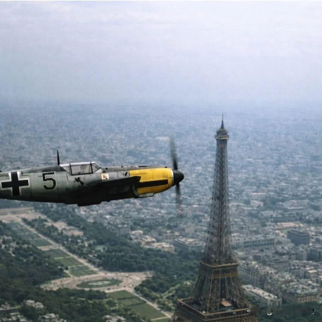 1940年6月5日,一架德国空军的梅塞施密特Bf 109战斗机飞越巴黎的标志性建筑——埃菲尔铁塔。 历史 历史老照片 二战 德国 战斗机 法国 巴黎