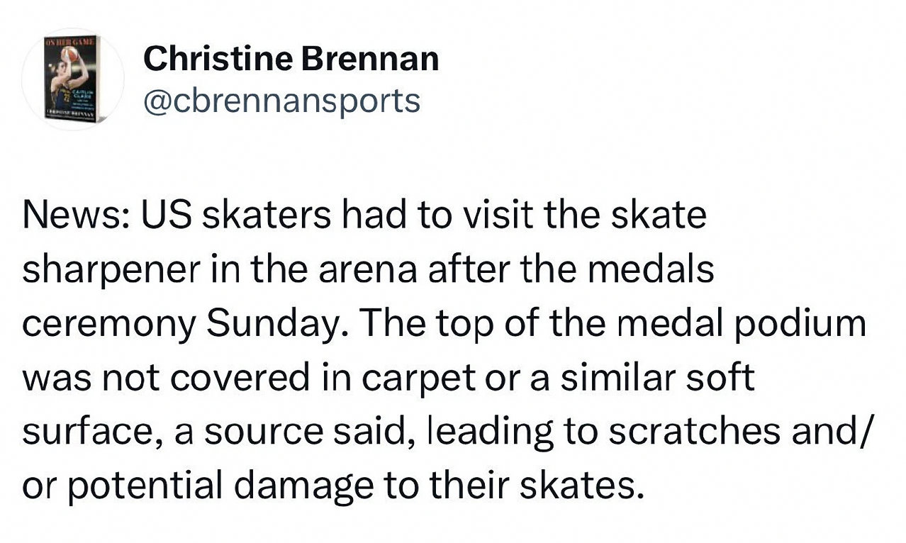 花滑颁奖台没做处理,领奖台表面并未采用橡胶等材料对冰刀刀刃进行保护,而是呈现出类似将石材切割后,如粗糙的柏油路面的状态。相关人员表示,领奖台表面粗糙如砂纸,仪式结束后,许多运动员发现冰刀刀刃出现异常。团体领奖的美日以及东道主都有运动员冰刀出现问题,磨刀霍霍赶场比赛。每天洋相都出的不一样。
