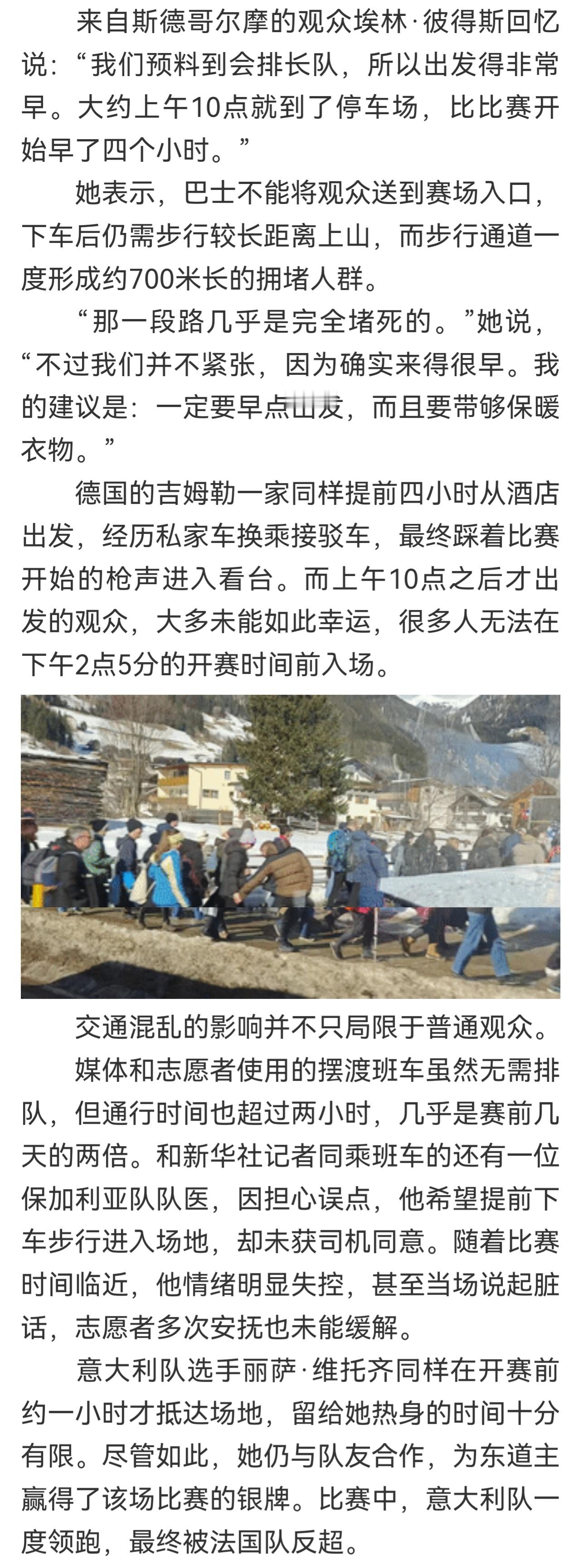 安泰塞尔瓦冬季两项竞技场赛前承诺的交通规划没实现,导致正式开赛大塞车,比赛还剩20分钟结束的时候,还有观众在匆匆入场。队医没赶上比赛开始,大崩溃。选手热身不够,匆匆就上。