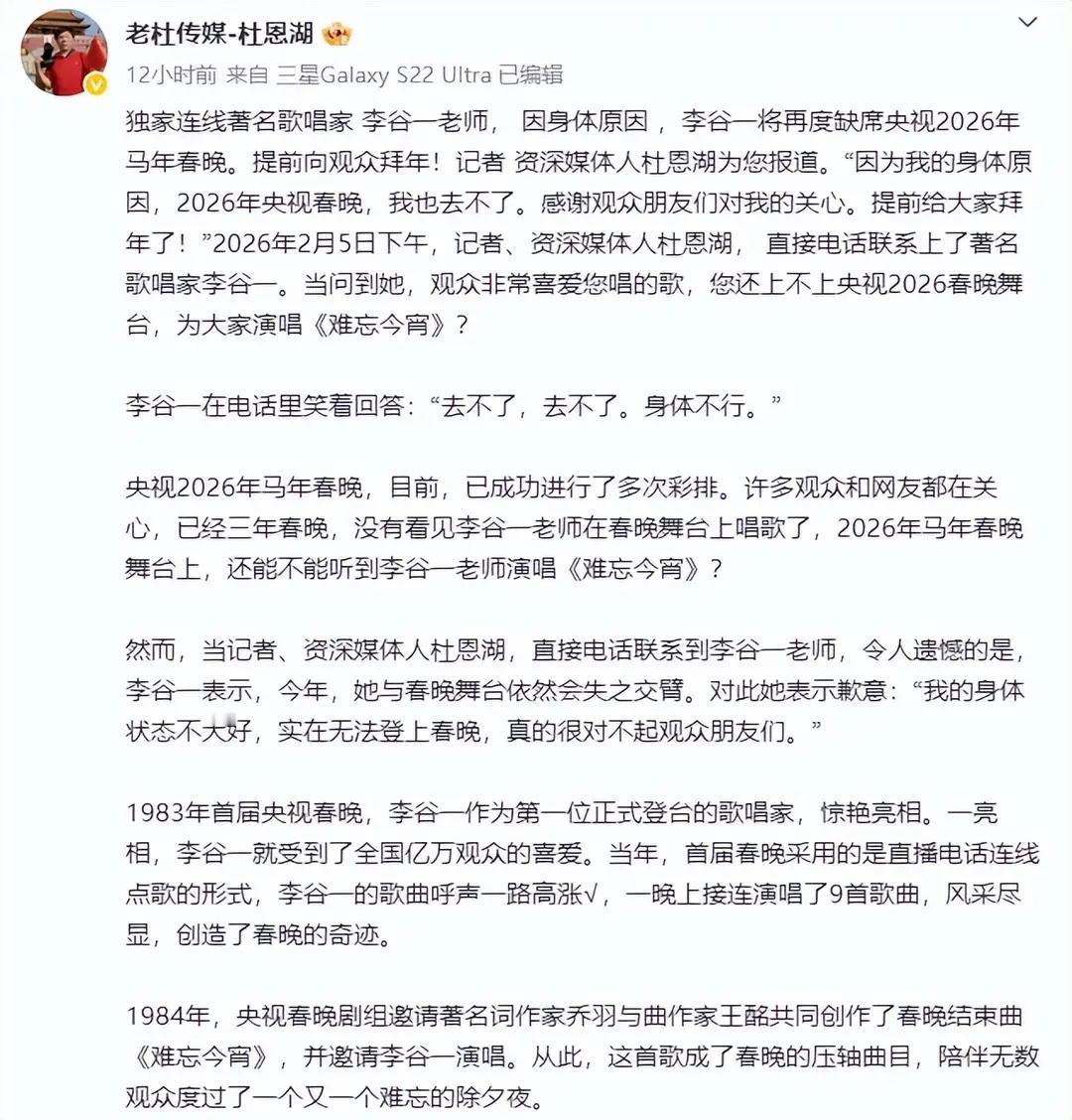 看哭了! 春晚招牌遗憾缺席: 2月7日媒体人爆料,著名歌唱家李谷一当众表示,身体不行,实在无法登上春晚,并且李老师还说:我的身体状态不大好,实在无法登上春晚,真的很对不起观众朋友们,感谢观众朋友们对我的关心,提前给大家拜年了! 春晚的记忆里,从来就少不了李谷一老师的身影。从 1983 年第一届央视春晚登台,到后来《难忘今宵》成了春晚的压轴绝唱,这一唱,就是整整四十多年。咱们从小跟着父母守岁,饺子煮好了,春晚快结束了,只要李老师的歌声一响,就知道除夕真的圆满了。可以说,没有《难忘今宵》的春晚,在心里,总觉得少了点 “年味儿的灵魂”。 说出来你可能不信,当年《难忘今宵》差点就没能登上春晚舞台!1984 年,这首歌刚创作出来,就被不少人扣上了 “靡靡之音” 的帽子,说旋律太舒缓,不够激昂,不适合做春晚结尾曲。是总导演黄一鹤力排众议,再加上李谷一老师的坚持,才让这首经典得以面世。 李谷一老师融合戏曲咬字、民歌唱腔和科学发声的独特演绎,一下子就走进了亿万观众的心里。这一火,就是四十多年,成了春晚舞台上唯一不可替代的 “文化符号”。 有人说,不就是少个歌手吗?这话可就错了!李谷一老师可不是普通的春晚嘉宾,她是春晚的 “定海神针”。回想一下,这些年春晚舞台换了多少代艺人,流量明星来了又走,唯有李老师,只要站在那里,一开口就是满满的情怀。 这就跟过年要贴春联、吃饺子一样,李老师的《难忘今宵》,早已成了除夕的 “标配”。之前哪怕她有点小病痛,也从没缺席过,有一年她感冒发烧,依旧坚持唱完,声音还是那么清亮,这份敬业,现在的年轻艺人真该好好学学。 为什么这么多歌手翻唱《难忘今宵》,却始终无法超越李谷一老师?她的唱法自成一派,别人学不来。更重要的是,她的歌声里有真情实感,有对观众的爱,有对家国的情怀。 这次李老师亲口说身体不行,那是真的扛不住了。人到了一定岁数,身体的零件就像用久的机器,经不起折腾。李老师已是耄耋之年,能一直坚守到现在,早已是奇迹。她心里装的全是观众,哪怕自己身体不适,首先想到的还是 “对不起观众”,这份真诚,比任何华丽的舞台表演都更打动人。 李老师的缺席,虽然让春晚少了一个经典画面,但与其遗憾,不如送上最真诚的祝福。李老师用一辈子的时光,给我们留下了最珍贵的春晚记忆,现在,她该好好歇一歇,好好照顾自己的身体了。 今年的春晚,虽然听不到她现场唱《难忘今宵》,但怀念她的这份情怀,从来不会因为缺席而变淡。希望李谷一老师早日康复,平安顺遂! (每天更新,欢迎关注,喜欢文章的可以帮忙点个赞留条评~) 对此大家有什么看法?
