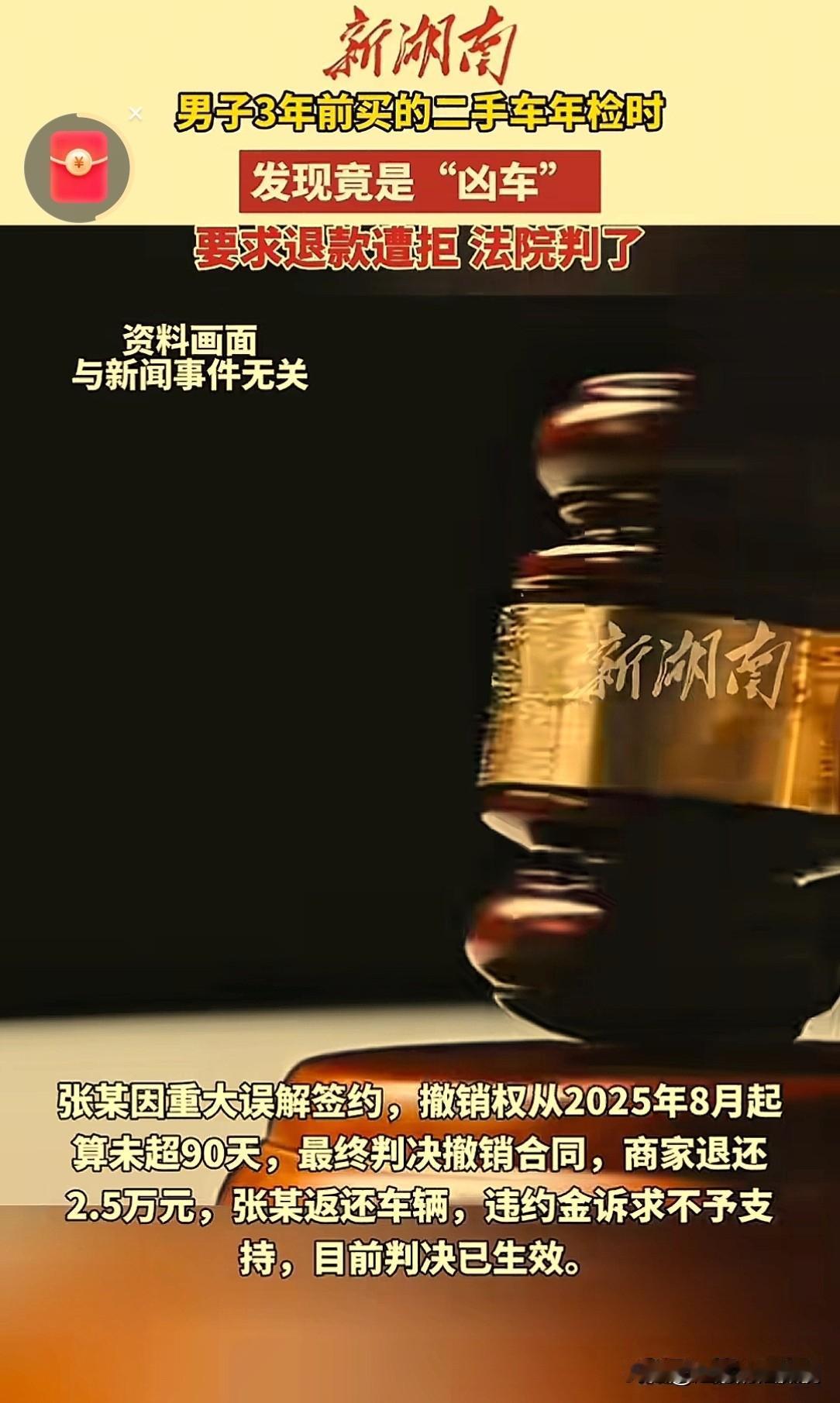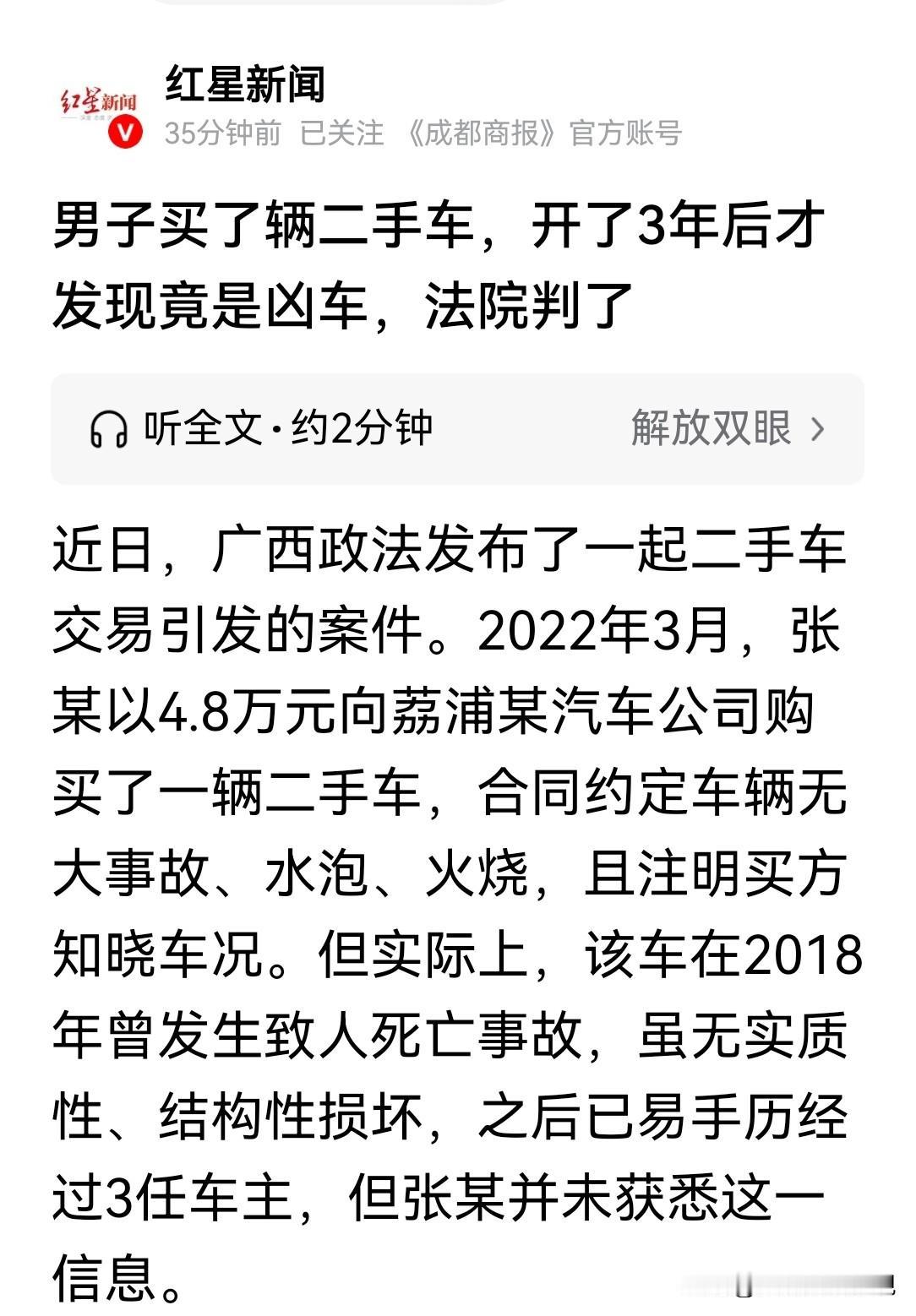 算不算欺诈?广西荔浦,男子看中一辆二手车,购买合同条款中明确:无重大事故、水泡、火烧,男子支付4.8万,将车开回家。3年后,年检时被告知,这辆车曾发生过致人死亡的大事故。男子膈应坏了,以二手车公司隐瞒实情,故意卖给自己凶车为由,将其告上法庭,要求撤销合同、退全款、并支付违约金。法院这样判! 张某一直想买辆车,但手头资金不足。 2022年,他在当地的二手车市场,经过一番比较和挑选,在一家汽车公司看中了一辆二手车。 这辆车外观看着还挺新,内饰也收拾得比较干净,价格只要4.8万元。 这个价格在他的预算范围内。 在和销售人员沟通时,对方信誓旦旦地保证,这辆车没有发生过重大事故,也没有水泡、火烧的情况。 对方还在合同里明确注明了这些内容,同时提到买方知晓车况。 张某虽然心里还是有点犯嘀咕,但看到合同里写得很清楚。 同时出于对大公司的信任,他放心地签了合同,交了钱,把这辆车开回了家。 有了车之后,张某的生活确实方便了不少,上下班不用再挤公交,周末还能带着家人出去逛逛。 这辆车也一直很给力,没有出过什么大毛病,张某对它也越来越满意,觉得这钱花得值。 2025年8月,张某的儿子到了该考驾照的年纪,他就打算把车过户到儿子名下,顺便做个年检。 可就是这次年检,张某对这辆车再也没有了好感。 在年检的过程中他被告知,这辆车曾经发生过致人死亡的交通事故。 张某听到这个消息,整个人都懵了。 他觉得不可思议,怎么也没想到,自己开了3年的车,居然是一辆“凶车”。 随之而来的是产生了心理反应,对这辆车膈应极了。 他觉得自己被汽车公司给骗了。 当初买车的时候,合同里明明写着,车辆无大事故,可现在却出了这样的事。 这辆车明明在2018年就发生过致人死亡的事故。 虽然之后历经了3任车主,但自己作为最后一个买家,却完全不知道这个信息。 他觉得汽车公司,这是在故意隐瞒车辆的真实情况,侵犯了自己的知情权。 而且汽车公司的操作,属于欺诈。 他决定找汽车公司讨个说法。 张某找到了当初卖车给他们的销售人员,把年检时发现的情况说了。 要求汽车公司撤销合同,退还买车的全款4.8万元,并且支付违约金。 汽车公司的负责人,听到张某的要求后,却一脸淡定地否认了他的说法。 负责人表示,在交易之前,他们对车辆进行了检验,车辆各项指标都是正常的,不存在欺诈行为。 而且,他们认为张某的撤销权,已经超过了法定期限。 根据法律规定,买家在知道或者应当知道,撤销事由之日起90日内,可以行使撤销权。 现在距离买车已经过去了3年多,早就过了这个期限,所以他们拒绝退款。 张某气得直跺脚,他们觉得汽车公司是店大欺客、强词夺理。 自己明明是在不知情的情况下买的车,而且刚刚才知道车辆的真实情况,怎么能说撤销权过期了呢? 双方各执一词,争论得面红耳赤,但谁也说服不了谁。 无奈之下,张某决定通过法律途径来解决这个问题。 他们向法院提起了诉讼,把汽车公司告上了法庭。 在法庭上,张某地陈述了自己的遭遇。 他说,自己当初买车,就是冲着车辆无大事故才买的。 如果知道这辆车发生过致人死亡的事故,肯定不会买。 汽车公司的隐瞒行为,让他遭受了经济损失,和精神伤害,请求法院支持他的诉求。 汽车公司则坚持自己的观点:他们认为,车辆虽然发生过致人死亡的事故,但并不属于行业标准认定的事故车。 而且在交易前,已经对车辆进行了检验,不存在故意隐瞒的情况。 同时,他们再次强调,张某的撤销权已经超过了法定期限,法院不应该支持他们的请求。 法院经过调查和取证后认为,虽然这辆车从技术层面来说,不属于行业标准认定的事故车。 但汽车公司,作为专业的二手车交易机构,有义务对车辆的历史情况全面核验,向买家提供完整准确的信息。 然而,汽车公司并没有尽到这个义务,导致向张某提供的车辆信息不完整,存在过错。 车辆曾经致人死亡这个事实,和张某对车辆无事故的认知,存在着重大的偏差。 对于大多数人来说,一辆发生过致人死亡事故的车,在心里上会有一定的阴影。 而且这个事实,也足以影响车辆的价值,以及购买决策。 所以,张某在签订合同的时候,是基于对车辆情况的错误认知,构成了重大误解,符合撤销合同的法定条件。 另外,关于撤销权的起算日。 法院认为,应该从买家2025年8月,得知车辆事故的当日开始计算,并没有超过90天的法定期限。 但考虑车辆已经使用了3年,存在一定的贬值和磨损。 以及双方在这次交易中的过错情况。 最终,法院一审判决:撤销双方签订的车辆交易合同; 汽车公司退还张某2.5万元,张某返还车辆,并协助汽车公司办理过户手续; 对于违约金的诉请,因为合同已经被撤销,法院不予支持。 关注@赵哥的法律观 评论区发表你的看法。