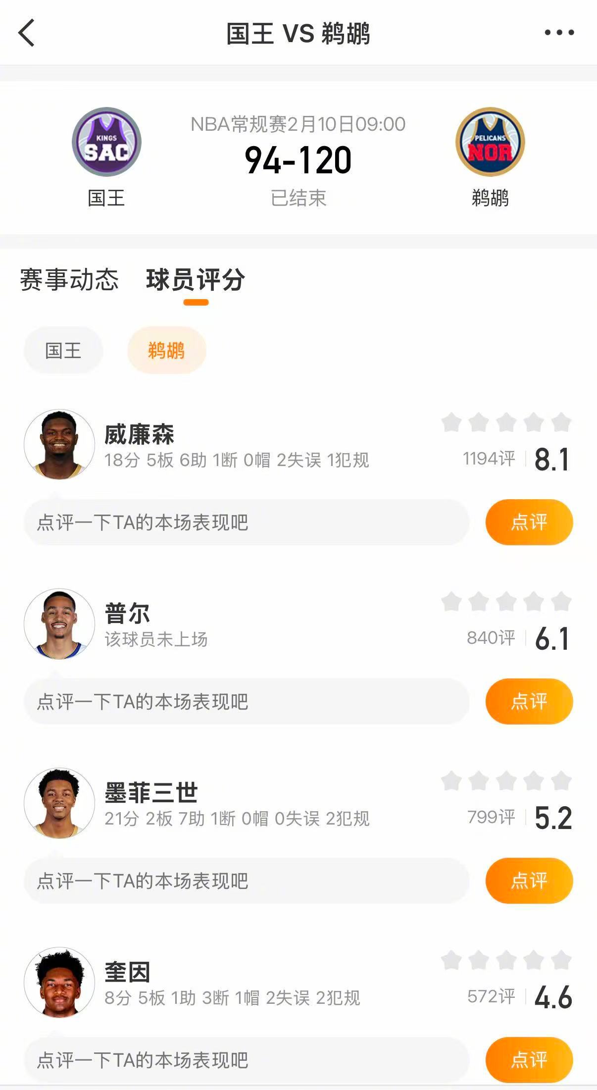 欢迎大家进入球队超话新奥尔良鹈鹕萨克拉门托国王 对球员表现进行评分!