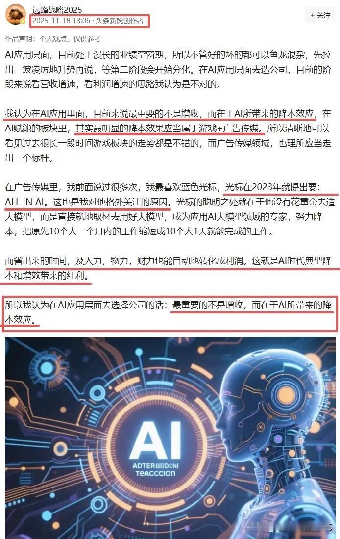 AI应用现阶段总体思路我过去讲过很多次,目前不是业绩,业绩也不应该成为目前的着眼点。 核心的着眼点就四个字:降本增效。 牢记这四个字,一个公司在AI加持下,能多大限度做到降本增效,他未来的K线图就有多大的想象空间,业绩这个东西也是建立在这个架构之上才能得到释放的。 这也是当初为何我选中蓝色光标的最重要的原因。