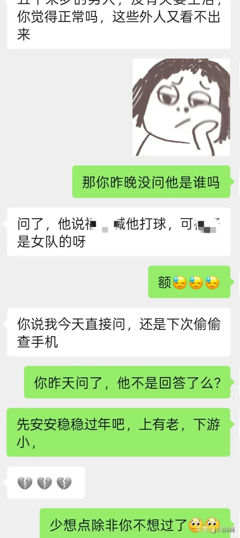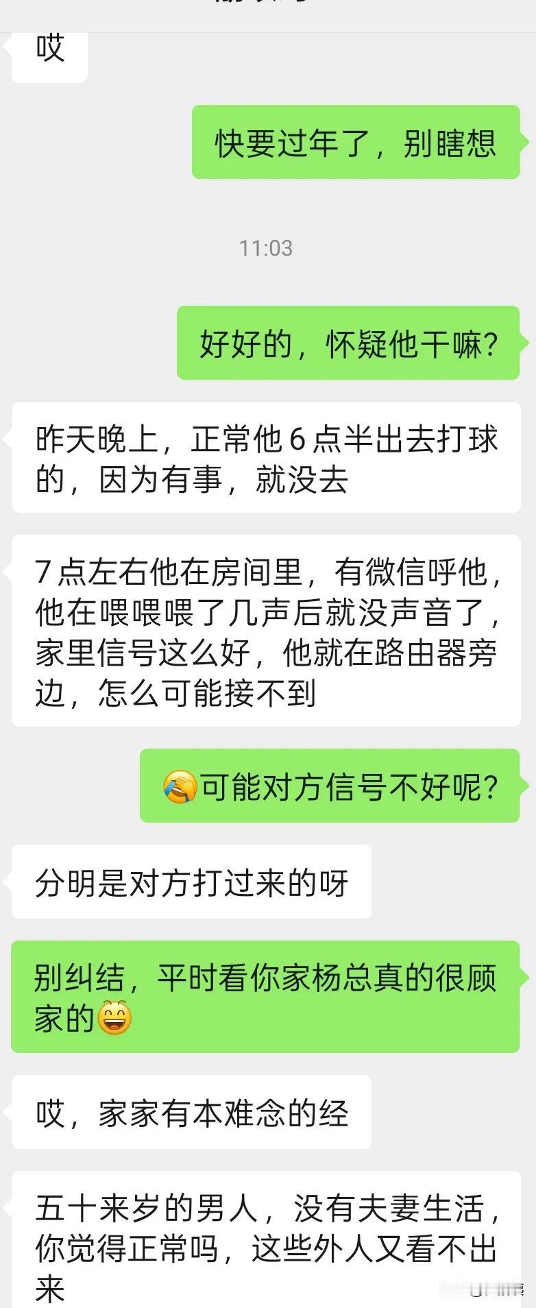 你们相信女人的直觉吗? 中年女人,觉得自己老公出轨了,有多大概率会出轨? 刚和朋友聊天,她怀疑老公外面有情况,起因是,昨晚他老公在家(正常一三五晚出去几个小时,打球),有个微信通话,他老公“喂喂喂”了几声以后,就没接听,她问了,她老公说某某喊他打球。 这个解释她是不信的,可不信又有什么关系呢? 年关将至,如果问了没有什么,男的心中不痛快;问了如果有什么,那几代人都过不好年,你们说是不? 忍一忍,风平浪静! 退一步,海阔天空!