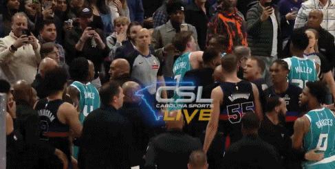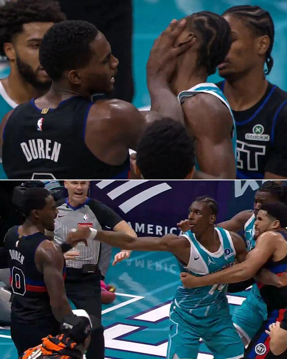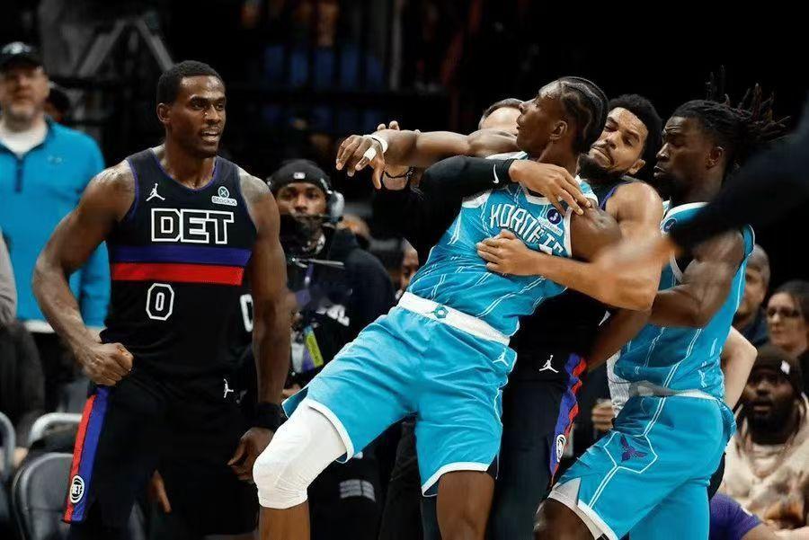 活塞和黄蜂的比赛发生大规模群殴! 杜伦造成迪亚巴特犯规 犯规后,杜伦&迪亚巴特两人争执顶牛 迪亚巴特对杜伦再次挥拳 但被杜伦躲过 迪亚巴特紧追杜伦不放,黄蜂众人拼命拦截 本来局面都被控制住一些了 但第二轮冲突爆发 小乔布里奇斯挥拳 斯图尔特从替补席杀进人堆里直接输出小乔 斯图尔特顺势搂住小乔 场面极其混乱 最终迪亚巴特被众人架出场外 场上动手的迪亚巴特,杜伦,布里奇斯和斯图尔特被全部被驱逐。 不过相信他们会收获禁赛和大罚单! 斯图尔特是真行,这位詹姆斯死敌有事儿是真上。