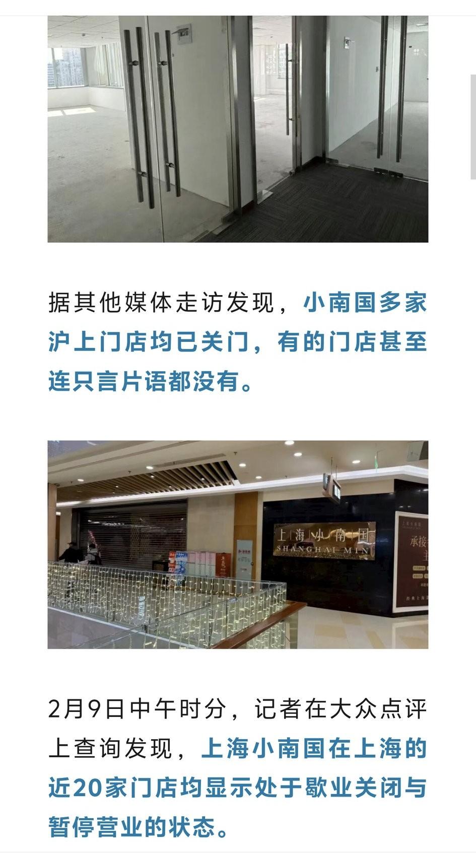 还有8000元,怎么取出来?上海小南国突然倒闭,这事儿真让人猝不及防。 2月初,上海多家门店毫无预告就停业了,正值年夜饭预订高峰,一堆消费纠纷爆发。我听说小南国不错,就订了他们家的年夜饭,付了年夜饭订金。 上个星期,我接到电话,被告知公司退款但时间不定,我预付的1000元订金难退。而且,手中的储值卡也成难题,上次充了1万呢。 其实网上早有端倪,1月底就曝光厨师罢工、出不了热菜的情况。我看到了网上的新闻,还不相信,以为是对手故意在搞他们呢。 曾经,小南国2012年上市,2015年达到巅峰,旗下品牌众多。如今经过口罩😷之后,上海门店基本停业,只剩无锡、珠海等地部分门店还开着,真是令人唏嘘。 现在老百姓生活真的是不如从前了,店都倒闭了,钱嘛也拿不出来,打工的人也失业了,不知道明年的路该怎么走。