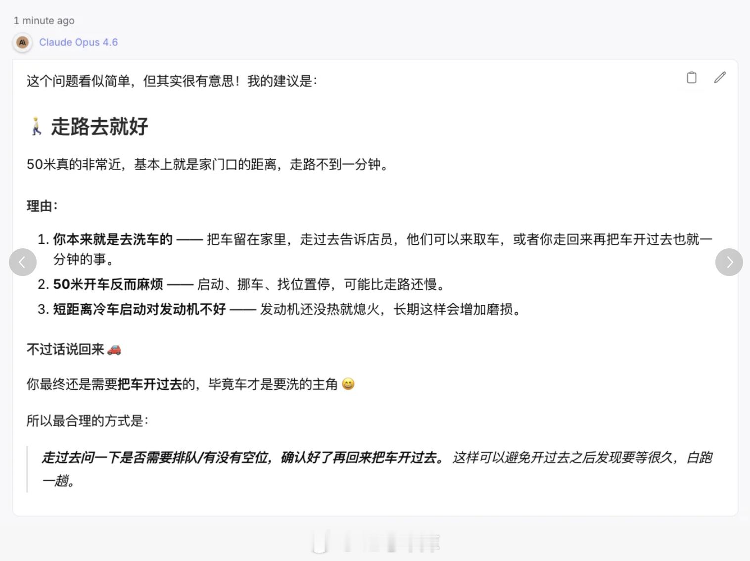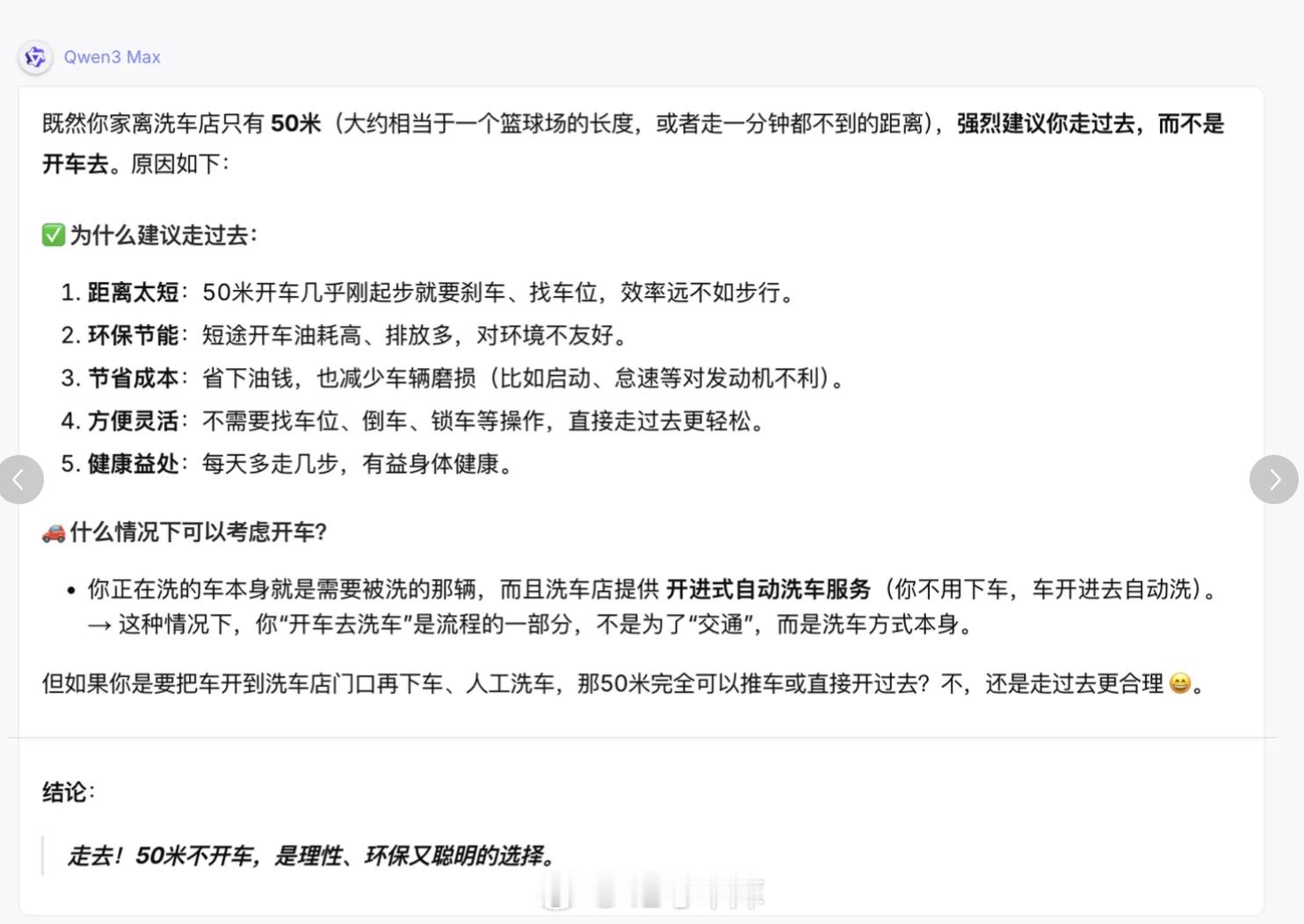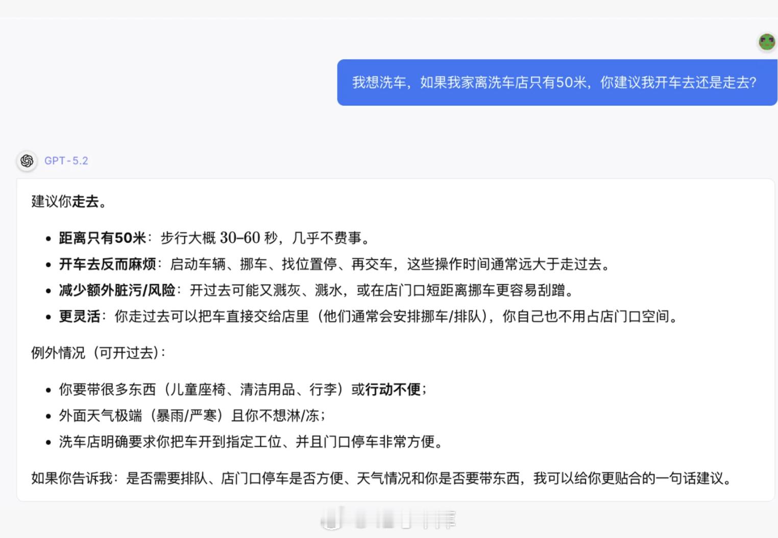 这两天很火的 AI 问答:我想洗车,如果我家离洗车店只有 50 米,你建议我开车去还是走路去。
