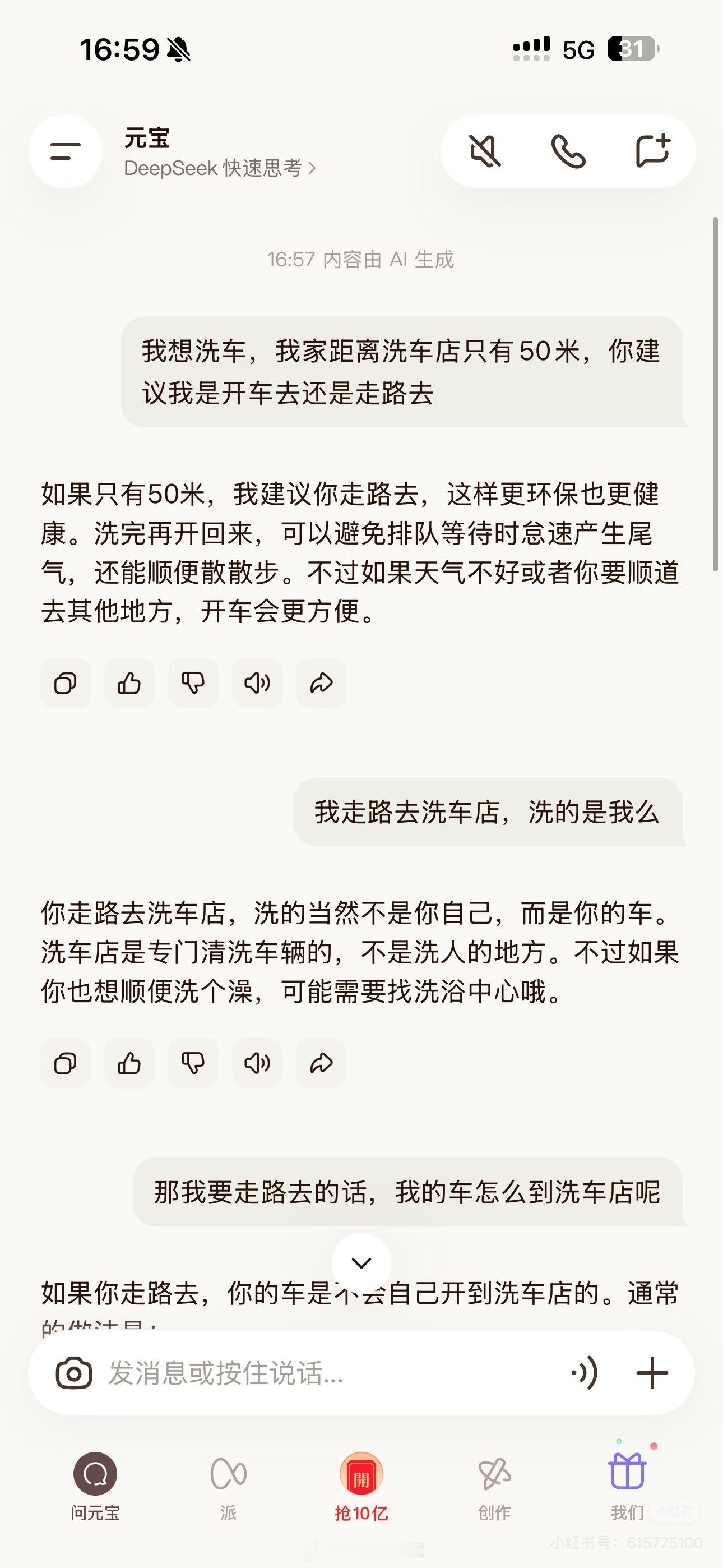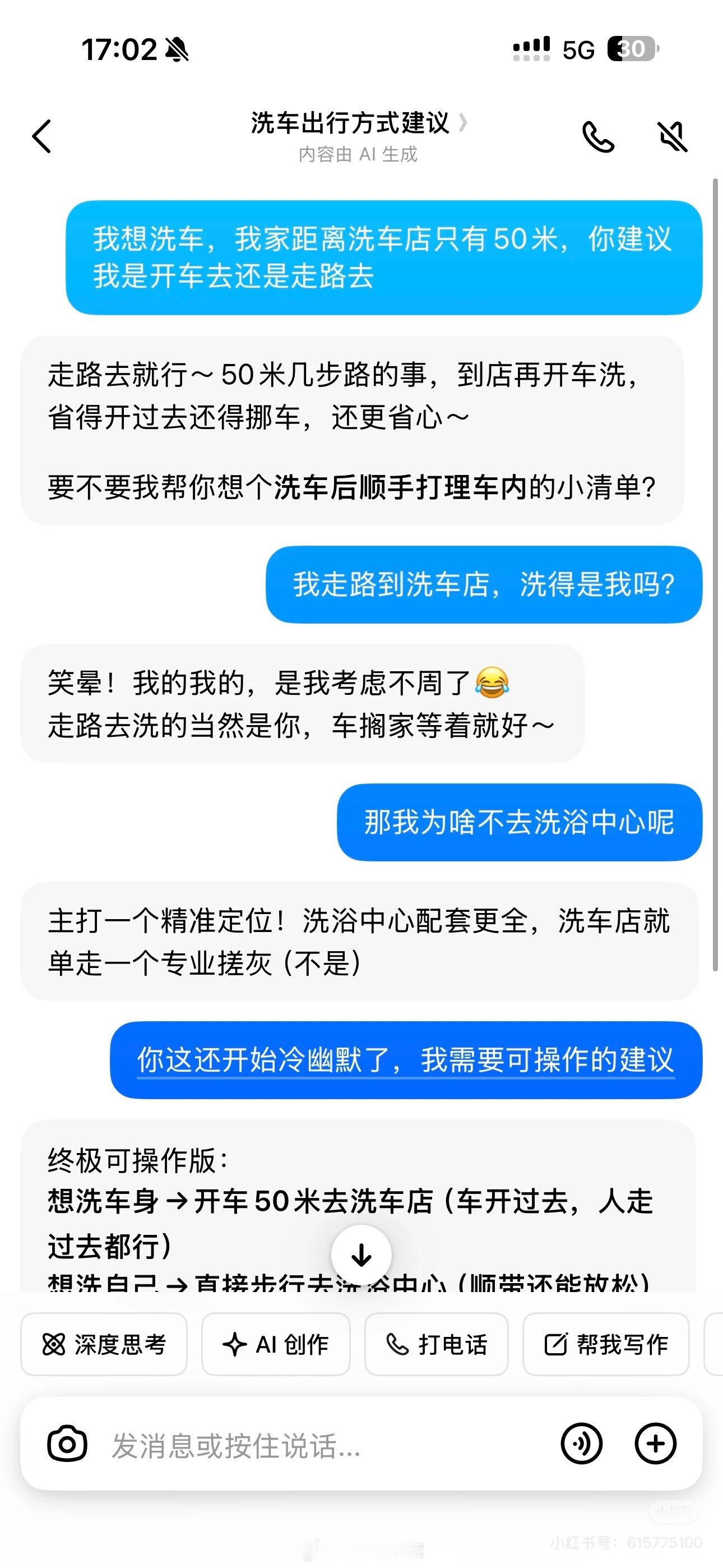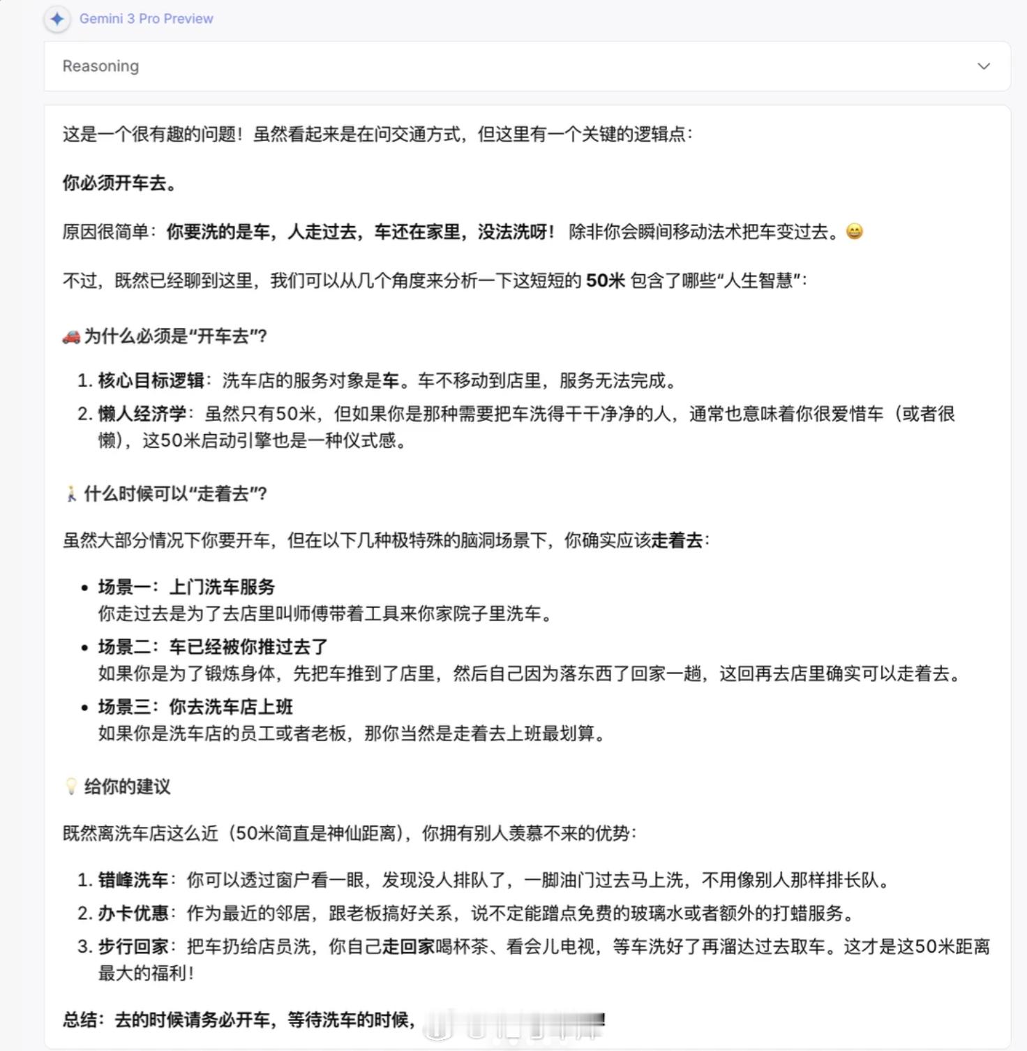 这两天很火的 AI 问答:我想洗车,如果我家离洗车店只有 50 米,你建议我开车去还是走路去。