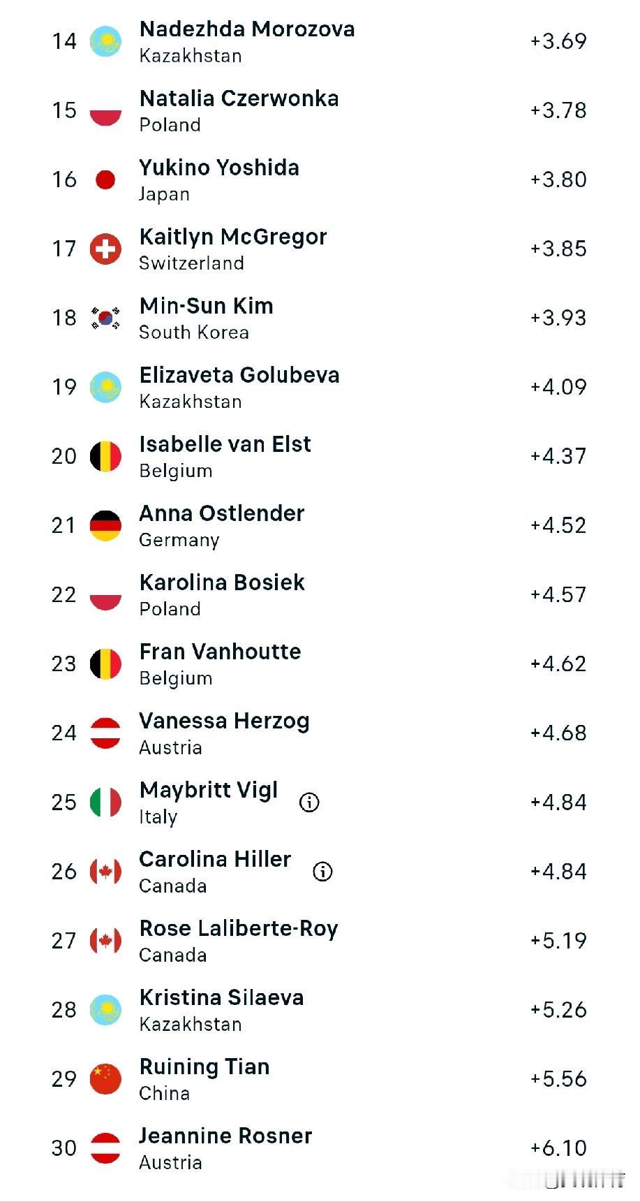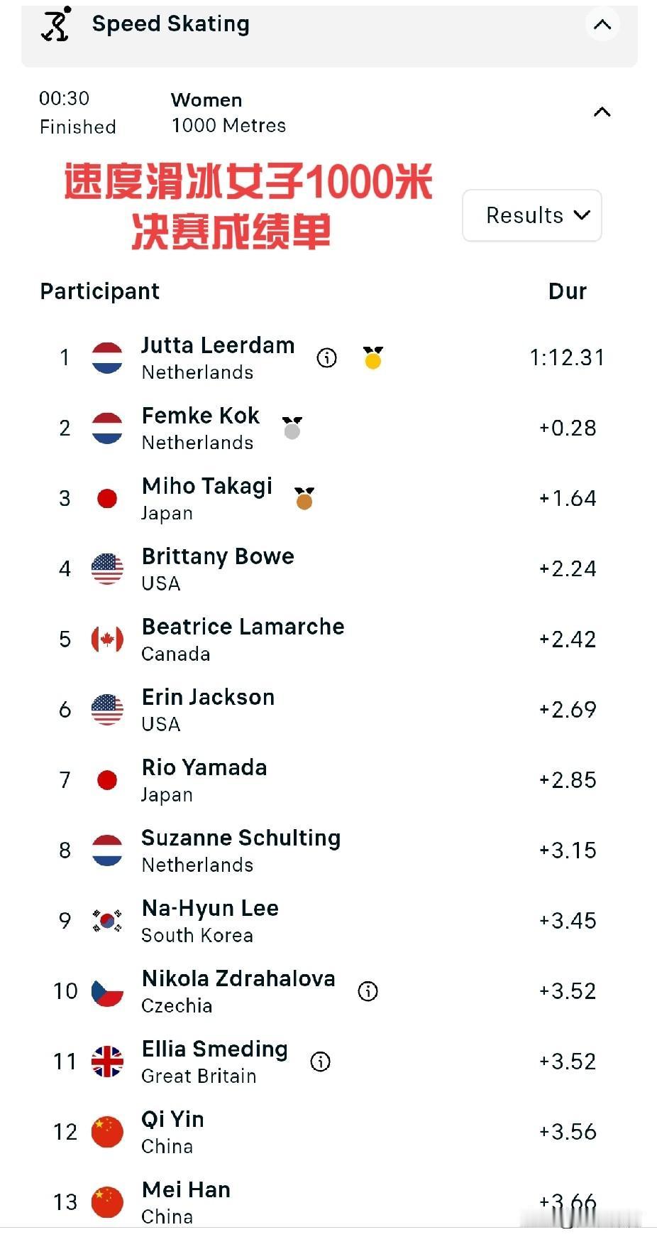 冬奥会女子1000米速度滑冰成绩单 🇳🇱荷兰选手获得冠军、亚军, 日本选手获得第三名。另外两名日本选手获得第7、16名。 在有30名选手参加的比赛中,中国选手获得12、13、29名。
