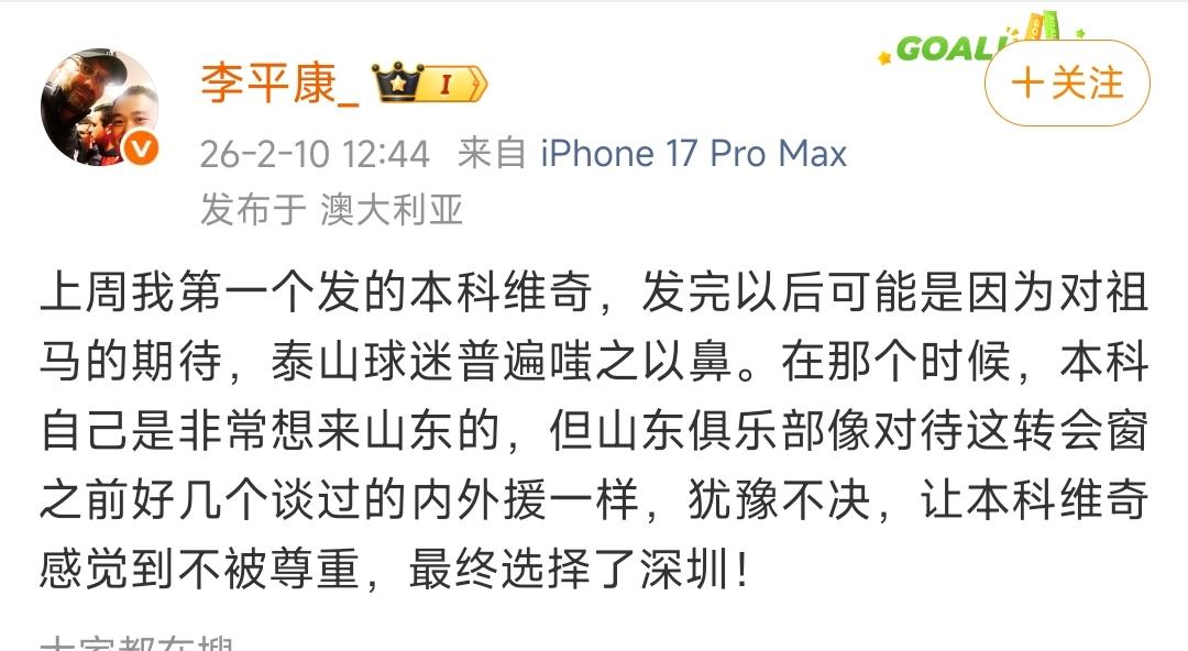 博主:山东泰山队管理层犹豫不决,让外援感到不受重视,最终没能签约。 一直紧盯泰山队的李平康,又又又一次发文,他表示,泰山队在和外援本科维奇接触的过程中,多次犹豫不决,让外援感到不被尊重,尽管此前其本人十分想来泰山队,但依照这样的情况,最终还是选择了新鹏城。 咱们先不谈李平康所说的究竟是对是错,以现在的引援现实情况来看。 从布希里到祖马,再到现在的这个本科维奇,一个一个绯闻对象纷纷“砍树”,让不少老球迷都迷糊了,到底泰山队的这位外援会是谁呀?又何时才能千呼万唤始出来呢? 更为关键的是,这位中后卫外援的实力到底如何,能否支撑起后防线的重任?可别最后花费了如此长的时间和精力,再来一个洛佩斯水平的。那到时候估计球迷得炸锅,新赛季也不要有什么想法了,老老实实保级就行。