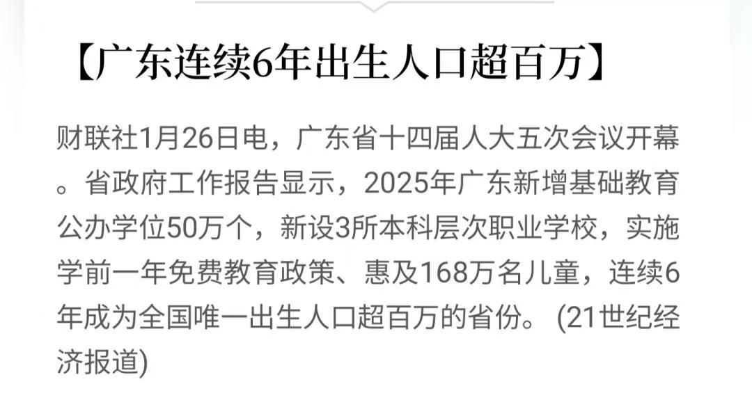 这年头,大家都在谈论“内卷”,谈论人口红利消失,但有一个地方似乎并没有这种焦虑,反而用实打实的数据给全国人民上了一课。没错,就是那个常年霸榜的广东。 最近各地陆陆续续交出了去年的经济人口成绩单,广东这一份答卷拿出来,确实是有点“嚣张”的。常住人口直接冲到了12859万人。这是什么概念?这就意味着,比上年足足多了79万人。要知道,现在不少地方都在为人口负增长发愁,广东不仅逆势上扬,还创下了历史新高。 把时间线拉长来看,这数据背后的“统治力”更强。广东已经连续37年稳坐中国经济第一大省的交椅,这个“霸主”地位至今无人能撼。更可怕的是,它还顺手拿了个人口第一大省,这一拿就是连续19年。今年这79万的人口增量,也让它毫无悬念地再次位居全国首位。有钱又有人,这大概就是传说中的“赢家通吃”。 很多人好奇,这么多人都往广东跑,到底图什么?而且去的人是不是都是去“躺平”的?数据告诉我们,去的大多是干活的“壮劳力”。在这1.28亿人里,劳动年龄人口占比高达66.38%,这个总规模放在全国都是最大的。这说明什么?说明广东的人口结构非常年轻,极具活力,并没有出现很多发达地区那样严重的老龄化僵局。 更让人意外的是,广东人不仅爱赚钱,还爱“造人”。在大家都不愿意生孩子的当下,广东的出生率达到了8.89‰。这个数据让广东连续7年成为了全国第一生育大省。仔细看更扎心,新生人口的数量几乎是死亡人口的2倍。这种自然增长的正向循环,给广东的未来储备了最基础的底气。别的地方是想办法催生,广东这边似乎根本不需要太操心。 当然,光靠“生”是不足以撑起这么庞大的人口增量的,关键是人家还能“引”。 广东手里握着广州、深圳这两张一线城市“王炸”,第三产业占比已经做到了57.5%。这种成熟的产业环境,就像一块巨大的磁铁。但广东并没有躺在功劳簿上睡大觉,为了把人留住,把人才引进来,政策力度一波接一波。 2024年,光是省外净流入人口就达到了27万人。这还没完,到了2025年,广东直接启动了“百万英才汇南粤”计划。这个名字听着就很霸气,目标也很明确,就是要进一步强化人口流入。这说明广东很清楚,未来的竞争归根结底是人的竞争。 无论是从经济规模、人口总量,还是从劳动力结构、生育意愿,再到政策吸引力来看,广东都构建了一个非常稳固的“护城河”。对于那些正在犹豫去哪里发展,或者想研究区域经济趋势的人来说,广东这份“作业”确实值得好好抄一抄。毕竟,真金白银的数据不会骗人,哪里机会多,哪里生活有奔头,大家的脚自然就会往哪里走。这79万人的选择,或许就是最好的答案。 以上内容仅供参考和借鉴
