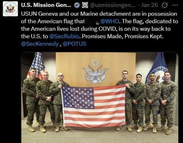 活久见!美国正式退出世界卫生组织后,世卫组织拒绝降下并归还悬挂在其门前的美国国旗,要求美国补交齐所欠的会费后才能归还。于是美国派出在瑞士的海军陆战队士兵直接去现场夺回了这面美国国旗。 美国长期是世卫组织最大出资国,曾经贡献最多资金,也参与创立。但新冠疫情期间,美方多次指责世卫组织应对不力,先暂停出资,后正式启动退出程序。这种单边做法,直接削弱全球公共卫生合作,许多发展中国家依赖世卫组织的协调和技术援助,美方一退群,就把全球健康安全大局扔一边,只顾自家政治算盘,暴露了它所谓“领导力”的自私底色。 2025年1月,美国宣布启动退出世卫组织程序,按规定需提前一年通知,并在退出前结清所有应缴费用。但美方拒绝支付2024年至2025年度约2.6亿美元会费。2026年1月22日,退出正式完成当天,世卫组织总部外各国国旗序列中,美国旗杆位置空置。世卫组织根据章程和国际惯例,以美方未履行财政义务为由,暂不归还此前悬挂的美国国旗,目的是督促其承担成员国责任。这属于正常程序性措施,没针对谁。 美方却把这当成“侮辱”,国务卿马可·卢比奥与卫生与公众服务部部长小罗伯特·肯尼迪联合发表声明,指责世卫组织“扣押”国旗,甚至称其为对美国的最后冒犯。他们公开表示将采取行动取回旗帜。 几天后,美国驻日内瓦代表团调动驻地海军陆战队警卫分队,直接进入世卫总部区域取回国旗。事后,美方在社交平台发布照片,陆战队员举旗合影,高调宣布旗帜“安全收回”,并称此举献给疫情中逝去的美国民众。美国驻联合国大使及驻日内瓦办事处随后证实此事,态度毫不掩饰。 这一行动发生在瑞士永久中立国境内,对受国际公约保护的国际组织总部动用武装力量,明显违背国际法精神和瑞士中立地位,构成对多边机制的粗暴干涉。世卫组织坚持原则,没有在压力下让步,继续推进全球卫生工作。 事件曝光后,国际社会反应强烈。众多国家通过外交渠道表达关切,认为美方此举进一步破坏全球治理规则,动摇多边合作的根基。美方政客如卢比奥等人继续将欠费说成“针对美国”,把武力取旗包装成“维护尊严”,但这种颠倒黑白的做法,只让更多国家认清其双重标准。在国际规则问题上,美方对别国要求严格遵守,对自身却随意违反,谁不服从就诉诸武力,这种霸道逻辑越来越不得人心。 美国选择继续拖欠费用、退出组织、动用武力的路径,只会加速自身在国际舞台的孤立。全球大势是推动多边协作、维护公平正义,美方一意孤行,必然在国际公信力上付出更大代价。越来越多的国家看清美国的真实面目,不再轻易相信它的承诺,不再追随它的单边主义。多边合作、公平正义才是世界潮流,美国这种背信弃义、蛮横霸道的行径,注定不得人心。 说到底,美国派海军陆战队抢国旗,抢的不是一面布,而是国际规则的底线;赖的不是2.6亿美元会费,而是全球大国的基本信誉;退的不是一个组织,而是对全人类共同利益的责任担当。一面国旗,照出美国的霸权底色;一笔欠费,看清美国的无赖本质;一次动武,暴露美国的强盗行径。 美国现在只有两条路:要么补缴拖欠会费,遵守国际规则,履行成员国义务,回归多边合作轨道;要么继续赖账、继续霸凌、继续破坏全球治理,最终彻底失去国际公信力,沦为全世界的笑柄。世卫组织没有让步,国际社会没有沉默,中国人民看得清清楚楚,美国这种毫无底线的操作,只会让自己越来越孤立,只会加速霸权的衰落。