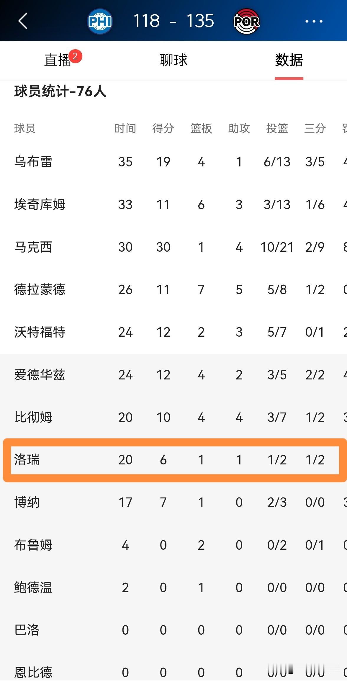 76人老将洛瑞真是雄风仍在!虽然今天76人在客场以118:135输给了开拓者,但是39岁的洛瑞依然老当益壮,他在替补出战的20分钟里,三分球2中1,其中罚球4中3得到6分1篮板1助攻1抢断1盖帽,没有出现任何的失误,他的场上正负值为+9。 作为一名39岁的老将,虽然洛瑞早已经巅峰不再,但是他在攻防两端仍然能够为球队提供不小的帮助。